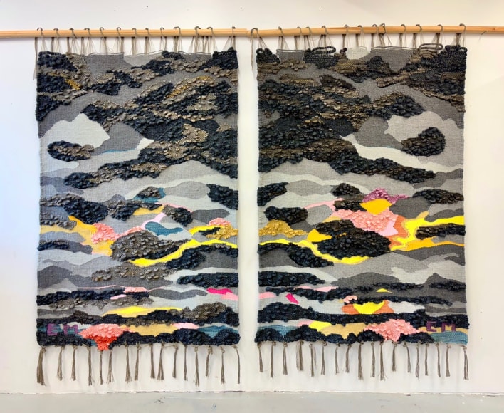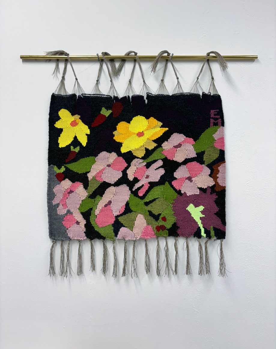 Trained at Winchester School of Art and the Royal College of Art in London, Melberg initially worked with large-scale installations, intricate sculptures, and mirrored surfaces before shifting towards textiles. Her turn to weaving and embroidery was not merely a technical transition but a response to personal upheavals—a way of grounding herself in the slow, deliberate nature of handcraft. She has since become known for her expansive textile works, blending plant-dyed and synthetic yarns, inherited fabrics, and found materials, often incorporating traces of past generations.