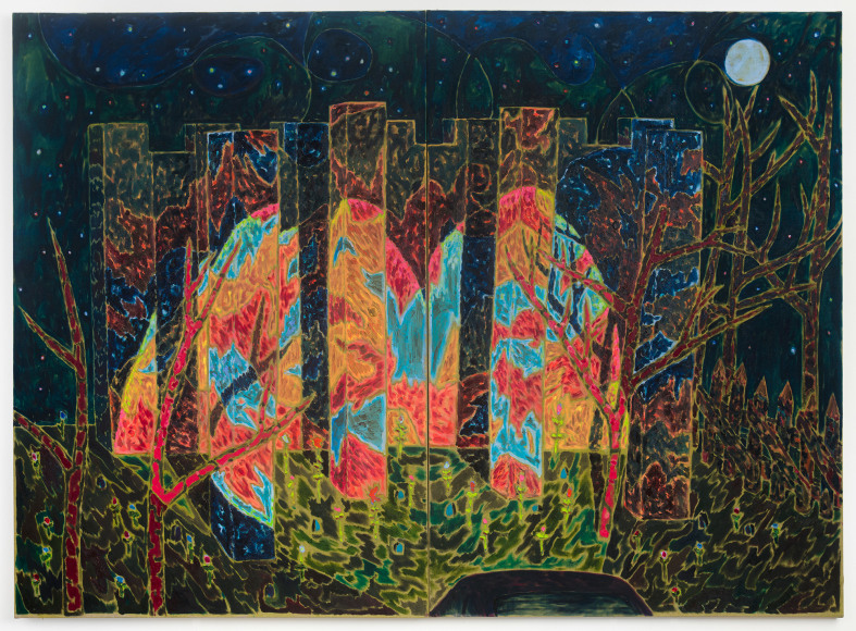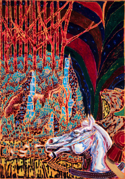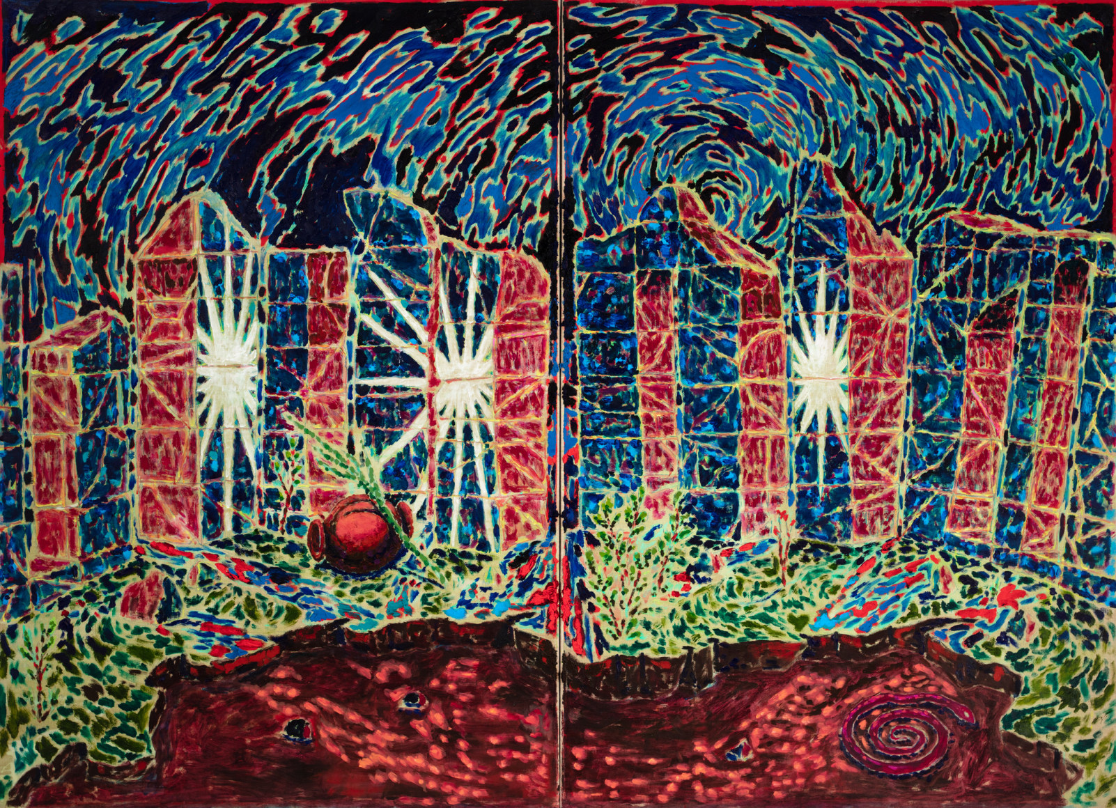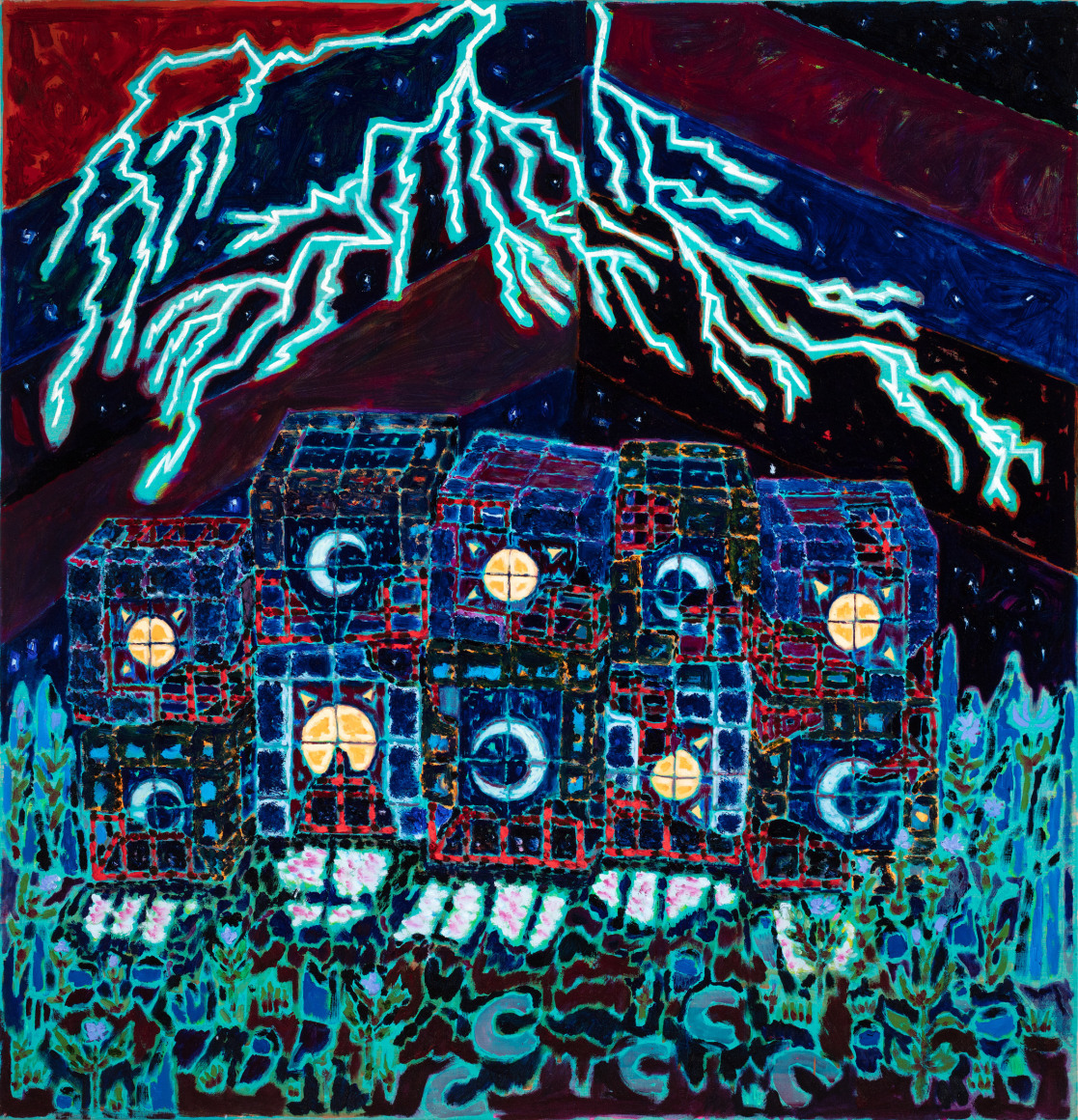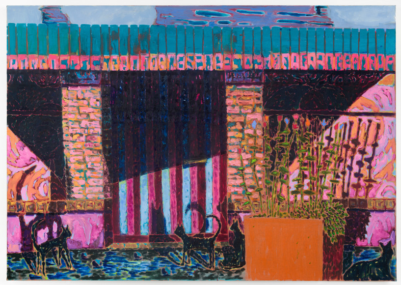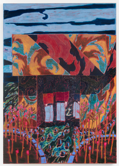 Kvålsvoll’s art is centred around painting, built through processing a form of collection of motifs, collecting elements from urban landscapes, architecture, ornamentation, decoration, images, art and painting history across different environments and eras. With his post-modern approach, Kvålsvoll isolates these motifs from their original context and gather them into visual spaces or constructed landscapes. Each series of painting are developed over extended periods of time. Every painting in the series is to be seen in context to one another, together they form a painting universe, where one can recognize features reappearing in several of the artworks. They create almost psychedelic depicted rooms and landscapes with a consistent theme and circle of motifs.