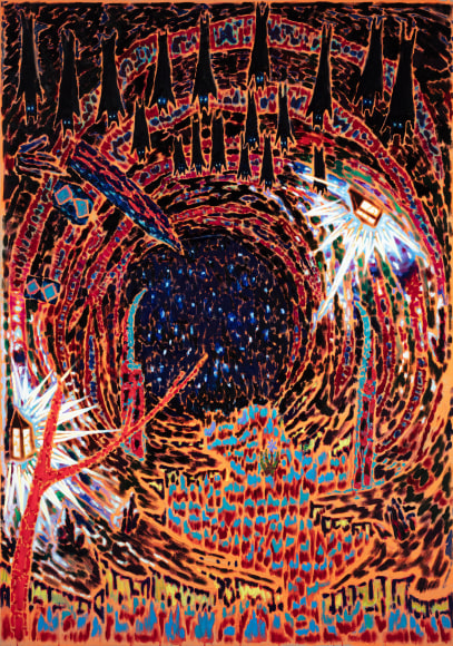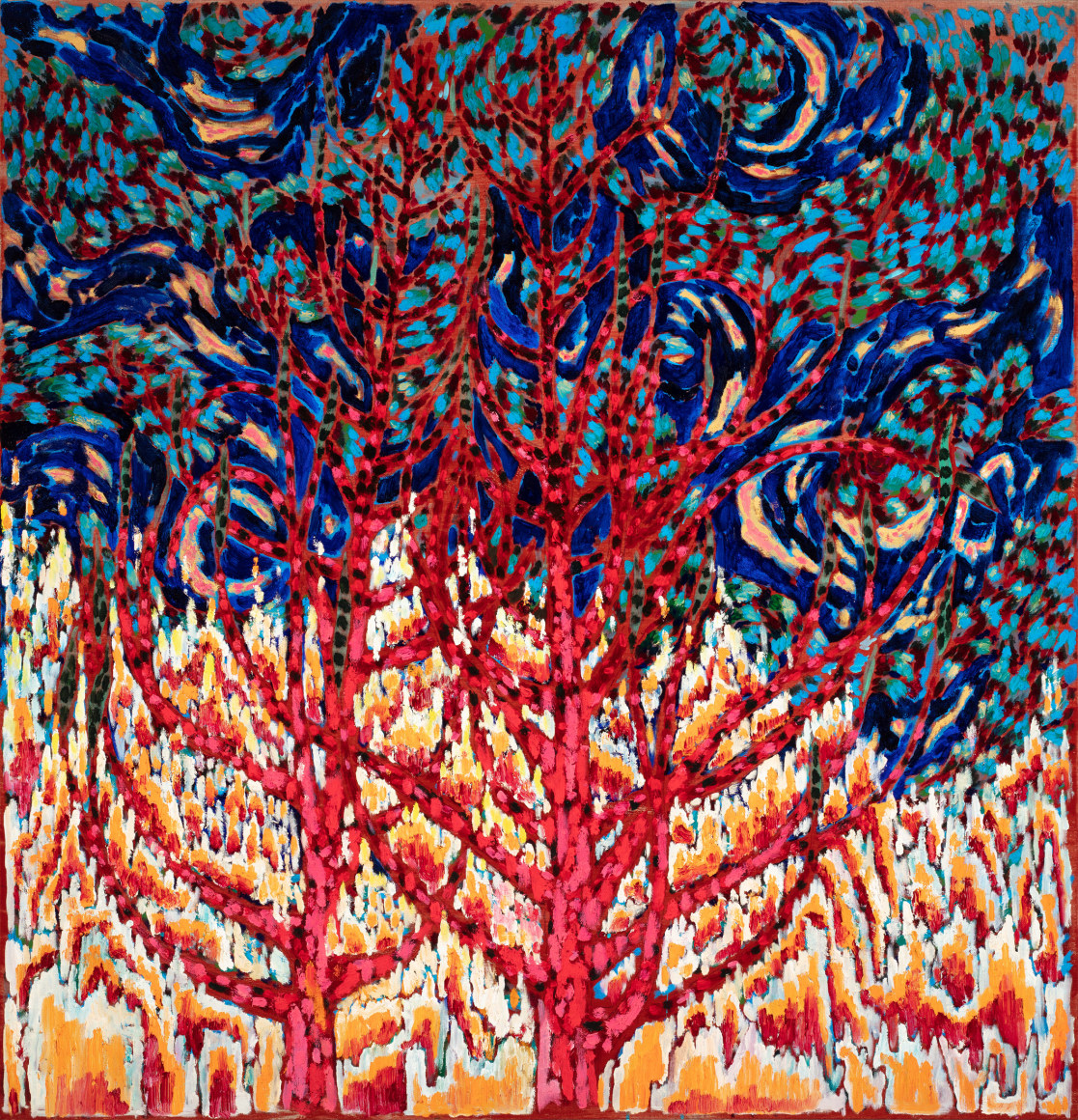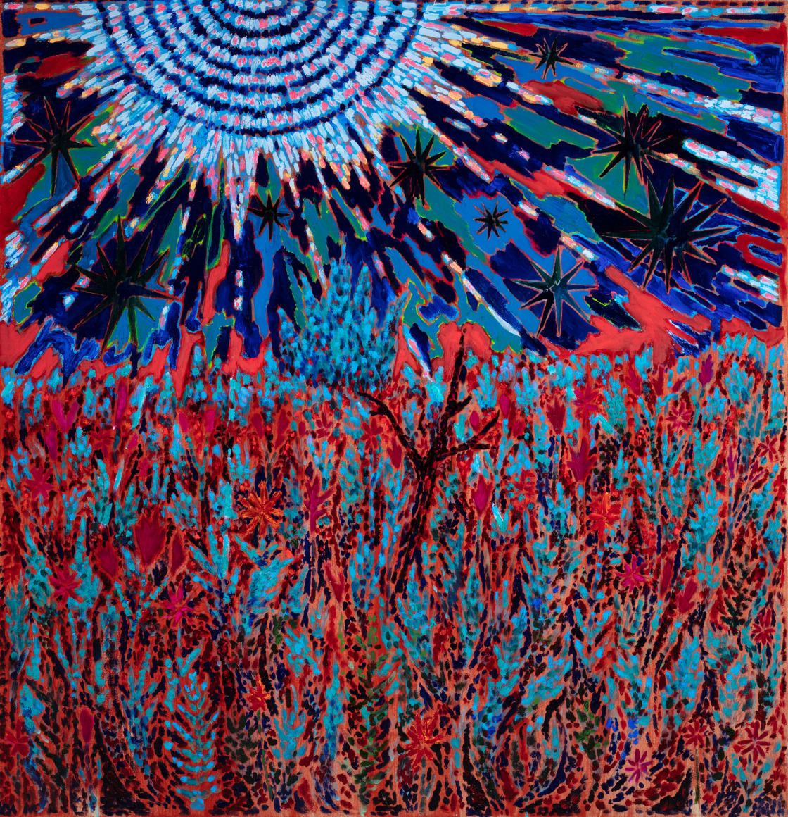 He removes and isolates motifs from their original context and maps the objects while comparing their similarities; the rearrangement of symbols and motifs helps to mystify them. In their new context, they get new associations, while they are abstracted by Kvålsvoll‘s use of colour, playing with the boundary between pattern and figuration in a post-Impressionist manner.