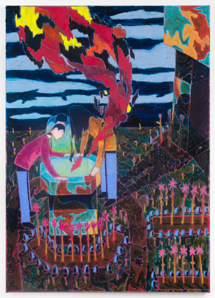 From 2019-2020, Kvålsvoll was awarded a studio at Kunstnernes Hus, with a completely unique skylight and size, leaving him free to liberally experiment with colours and materials. In this period, he developed a painting technique of bold brushwork that was of great importance to his practice. He experimented with contrasts such as thick materiality and thin layers, which resulted in wave-shaped pattern formations that transforms elements and motifs incorporated in Kvålsvoll’s paintings. He utilized the clarification of the physical in his paintings through material properties, inviting the viewer to a greater physical sensory experience.