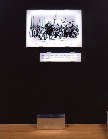 Between 1971 and 1972, Joseph Kosuth pursued studies in philosophical anthropology and philosophy under the guidance of Stanley Diamond at The New School for Social Research in New York. The philosophy of Ludwig Wittgenstein, among other influential thinkers, greatly impacted Kosuth's artistic development from the late 1960s to the mid-1970s. For over fifty years, Kosuth has been engaged in exploring the relationship between language and art through a variety of mediums, including installations, museum exhibitions, public commissions, and publications in Europe, the Americas, and Asia. His work has been featured in major international exhibitions such as Documenta and the Venice Biennale on multiple occasions.
