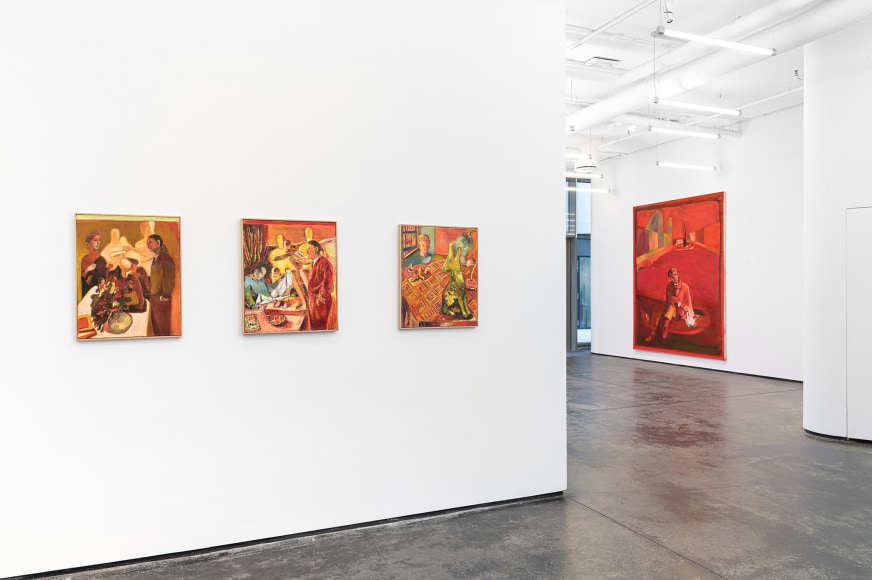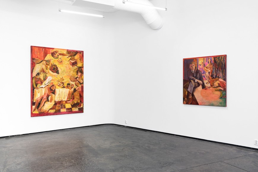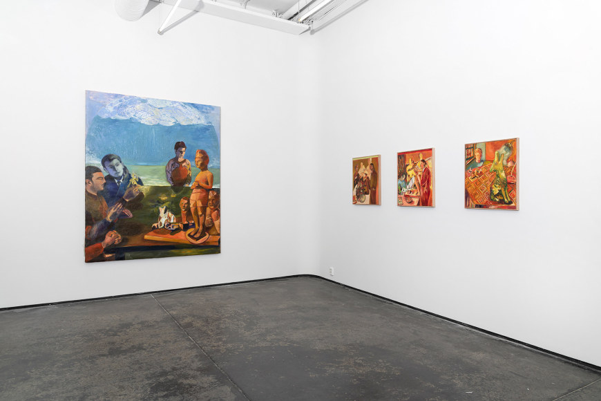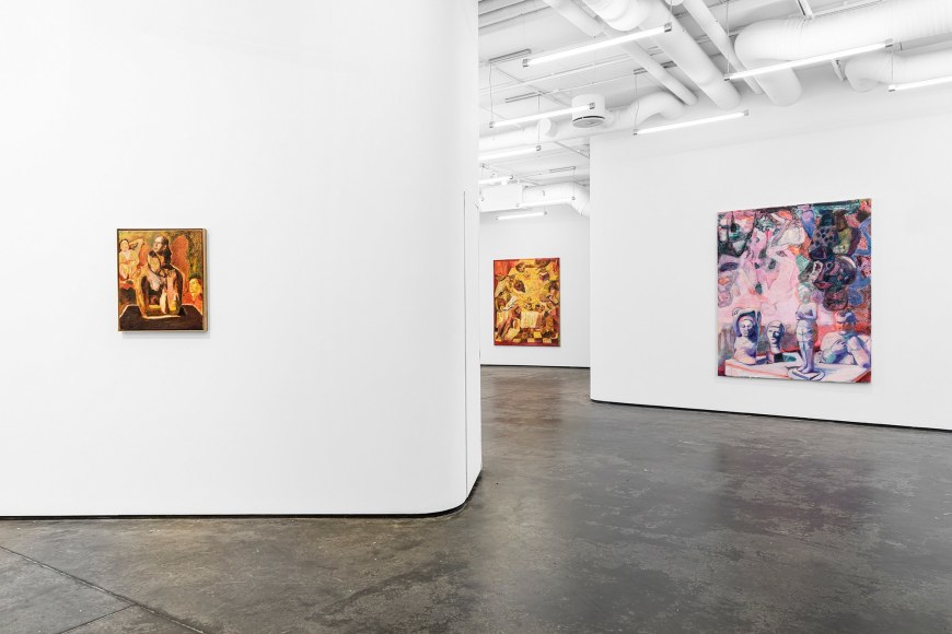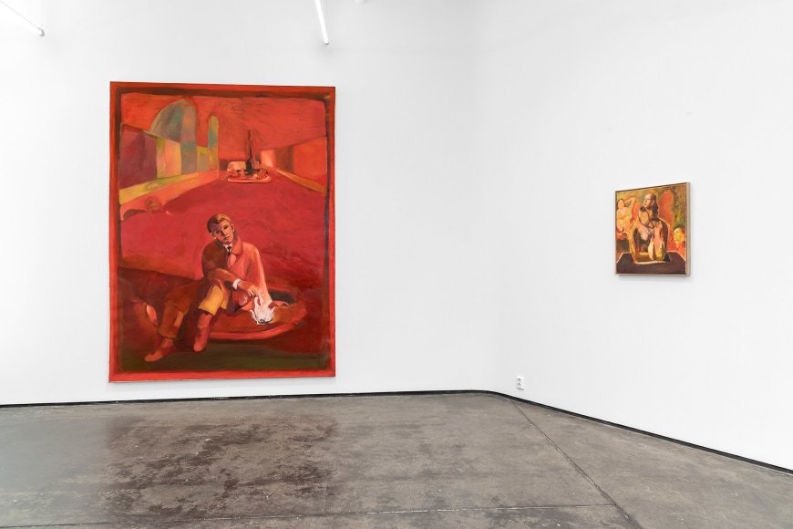 Most of the paintings are newly created and made after a residency period at Cà Pesaro Museum in Venice, when the museum was closed due to COVID restrictions. The empty museum gave Angelini the unique opportunity to autonomously move alone through the rooms.