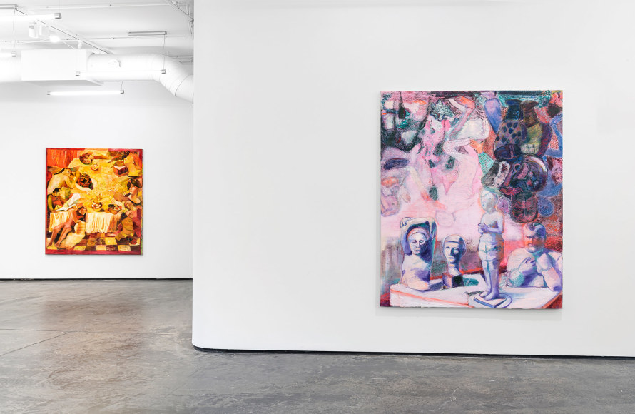 The works displayed in “Biography of a Painted Table” were born in the particular historical moment of isolation that many of us are experiencing today. This gave Angelini a chance to delve into her work uninterrupted for months on end, often simultaneously working on canvases resulting in a strong read thread running through them; a common intention. Although some of Angelini’s beloved subjects seen in her past work, make their appearance in some of the works displayed in “Biography of a Painted Table”, they do so with a new symbolic value; often suspended, sculptural and static.