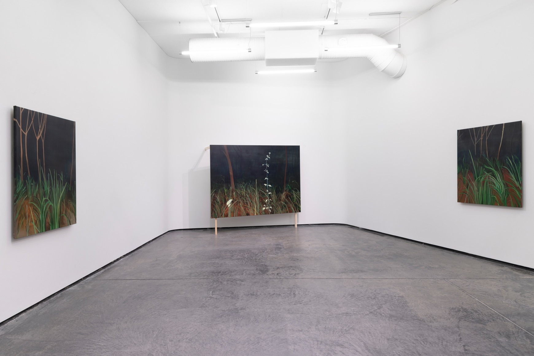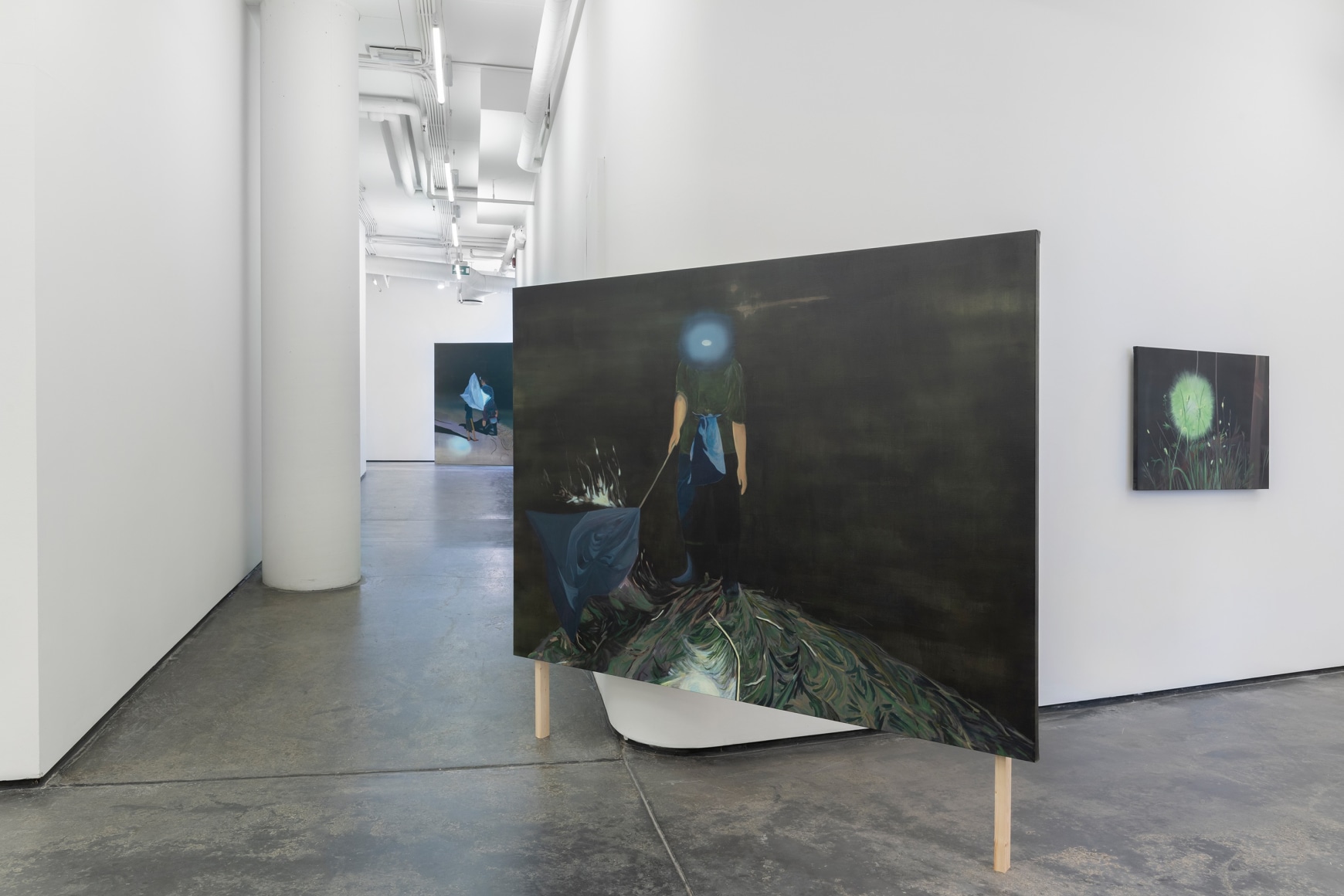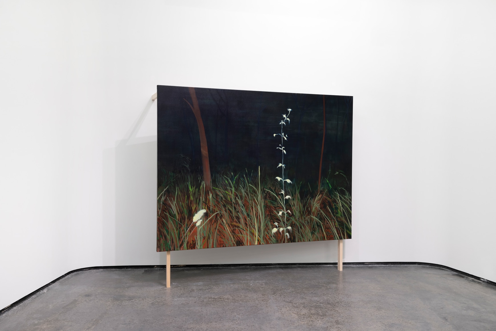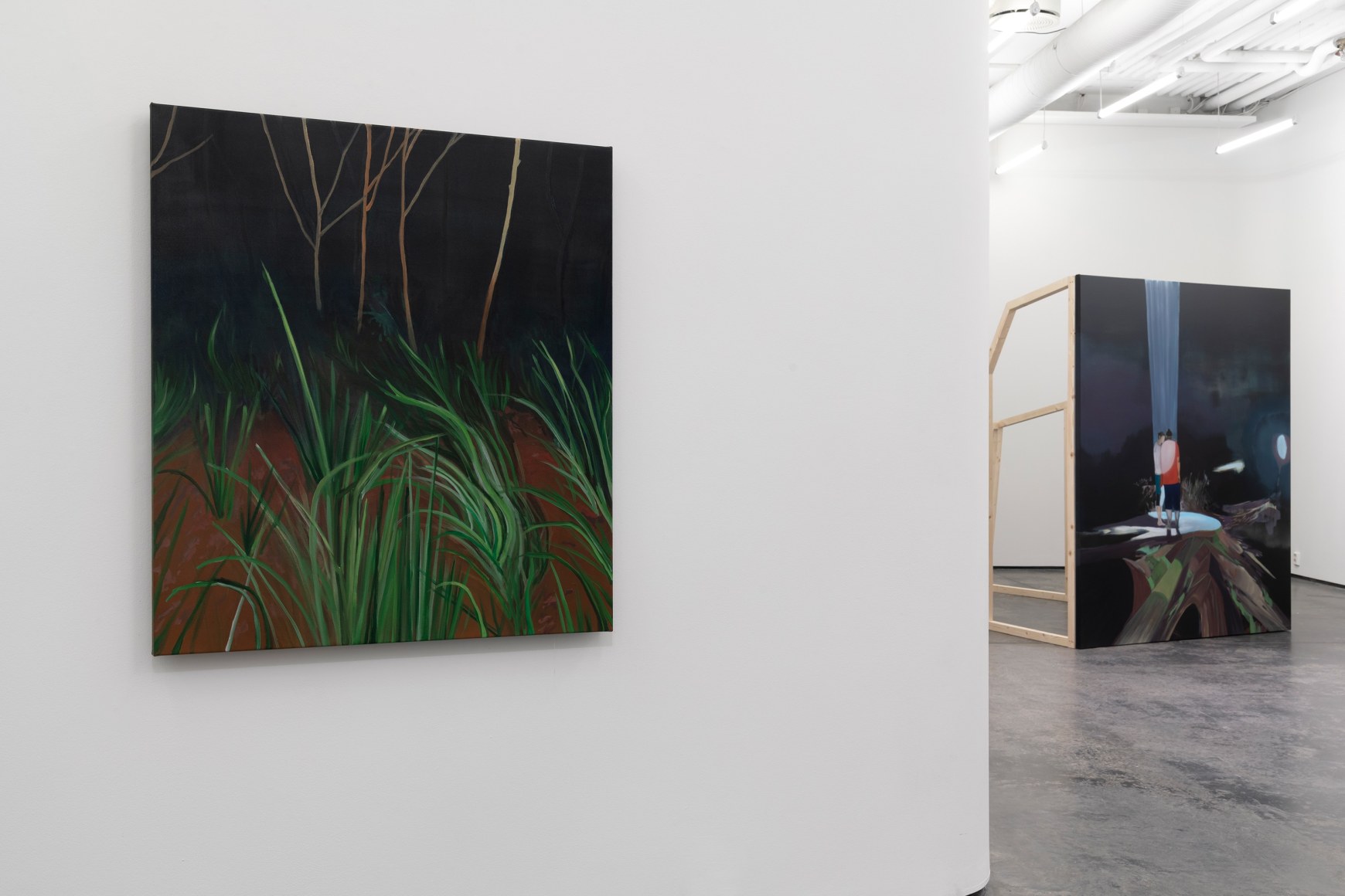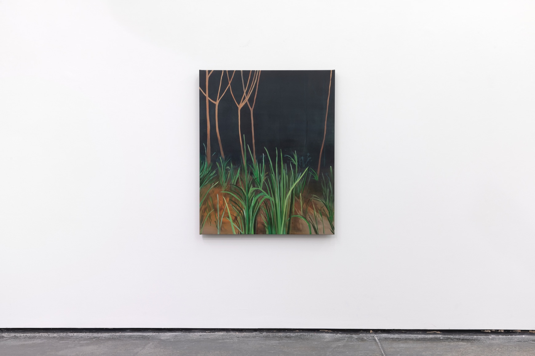 Wanthiang paints with thin, fast-drying acrylics, causing some surfaces to appear almost washed out and unexpectedly dry. Her motifs float on the canvas, and vegetation takes on anthropomorphic qualities. The humid landscapes depicted reveal strange elements, as if things lurk beneath the transparent yet oblique surfaces. In these recent paintings, people are looking for some things that we cannot see. The figures often appear as outlines or silhouettes and the light becomes the main character.
