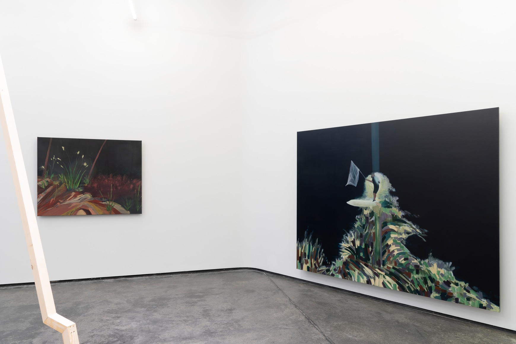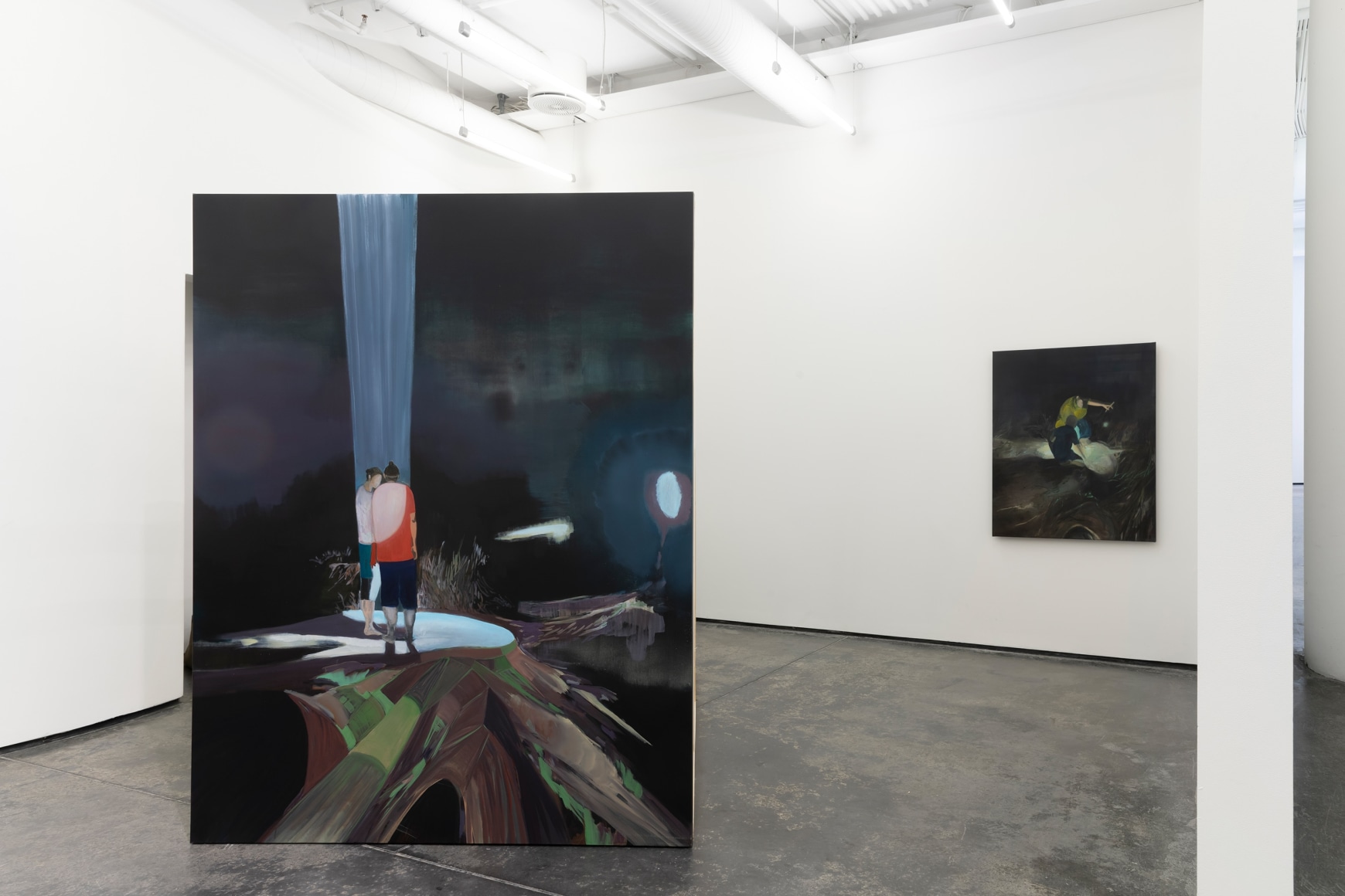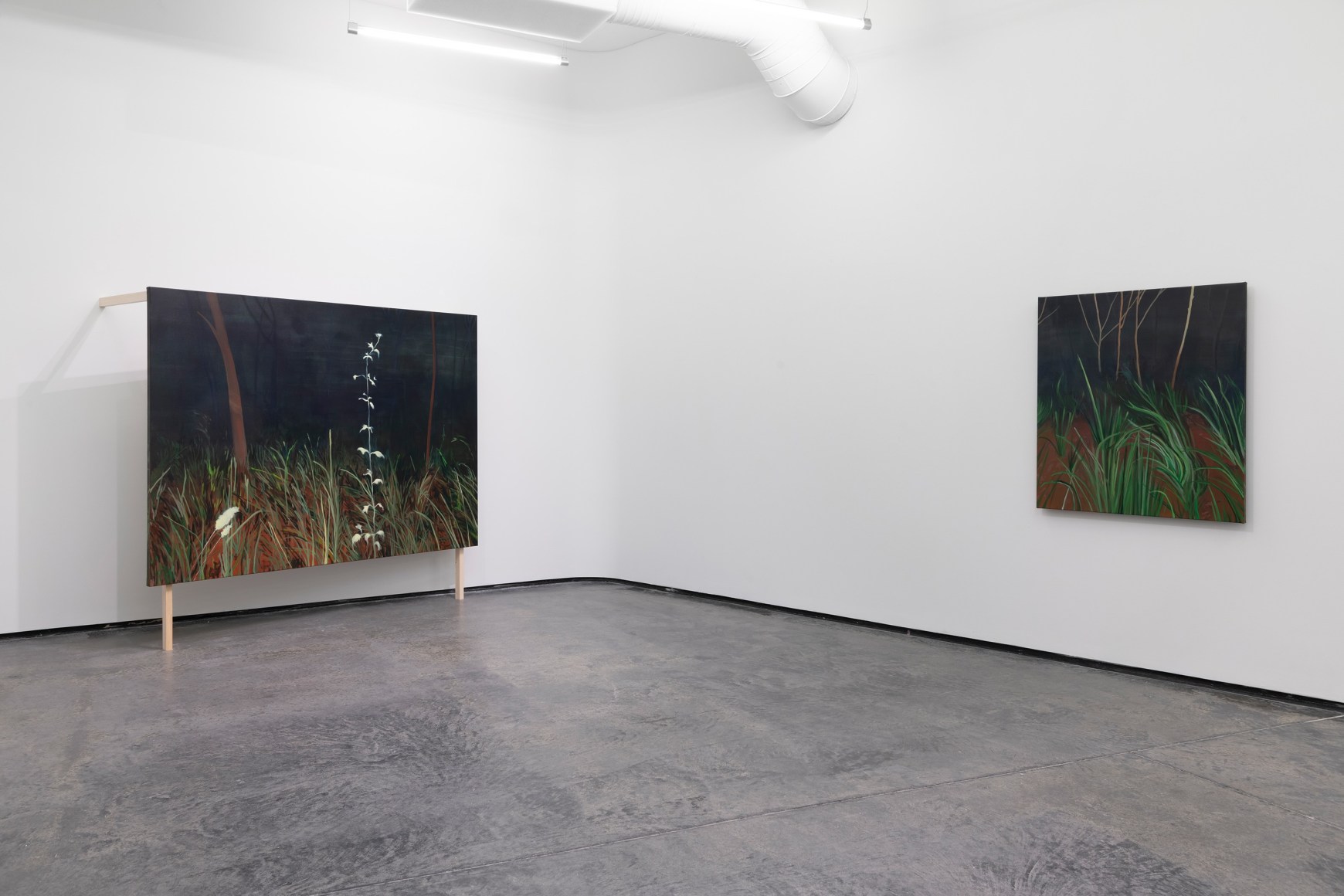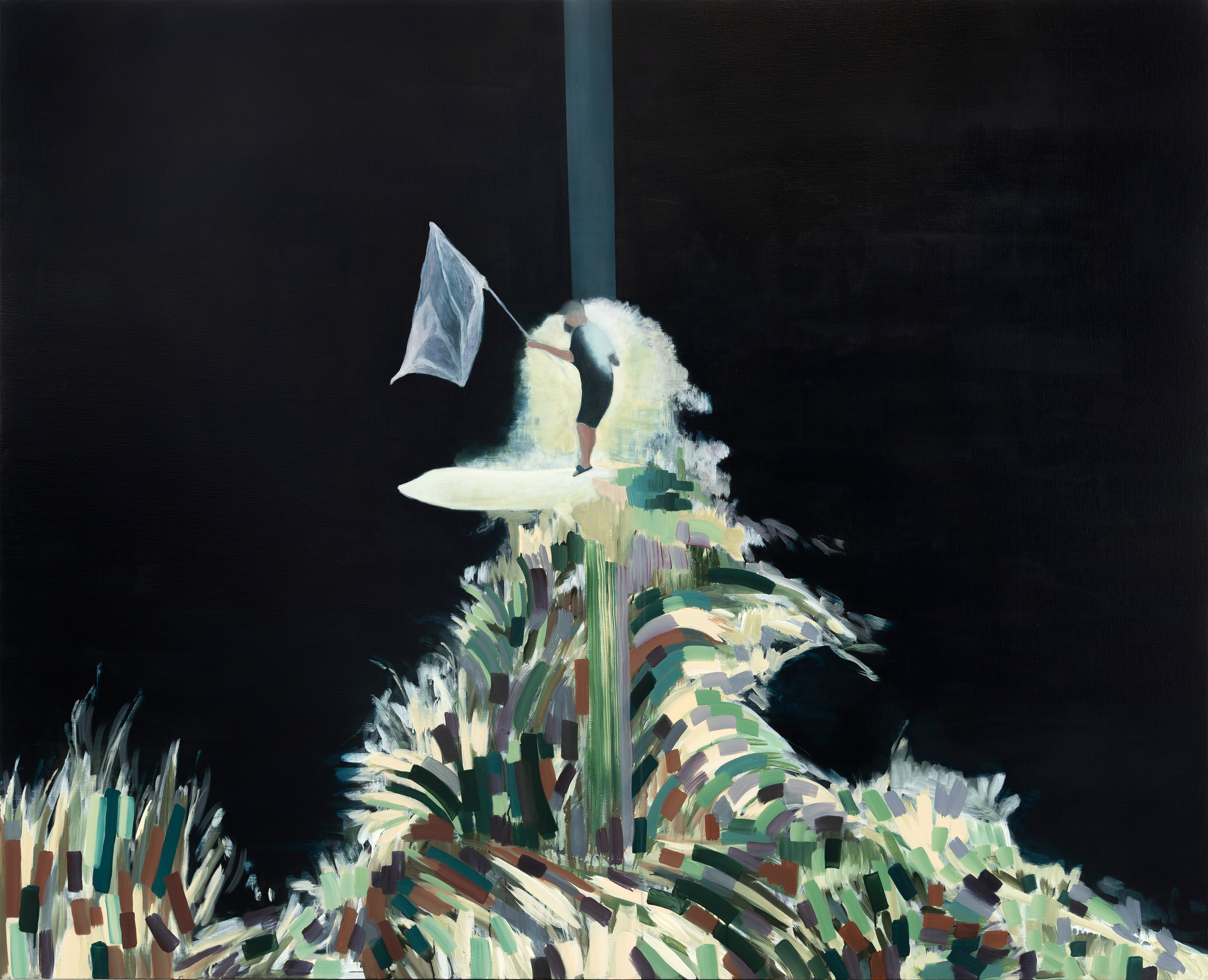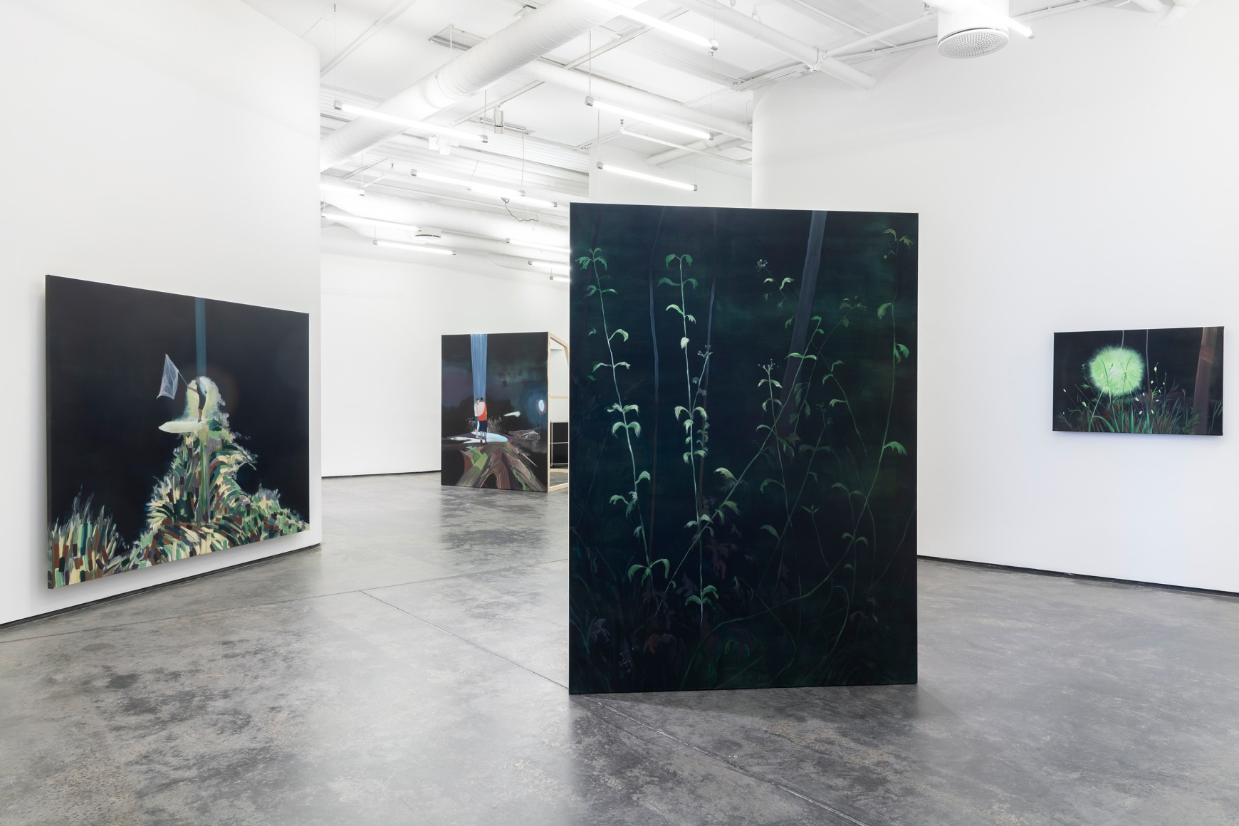 Wanthiang paints with thin, fast-drying acrylics, causing some surfaces to appear almost washed out and unexpectedly dry. Her motifs float on the canvas, and vegetation takes on anthropomorphic qualities. The humid landscapes depicted reveal strange elements, as if things lurk beneath the transparent yet oblique surfaces. In these recent paintings, people are looking for some things that we cannot see. The figures often appear as outlines or silhouettes and the light becomes the main character.