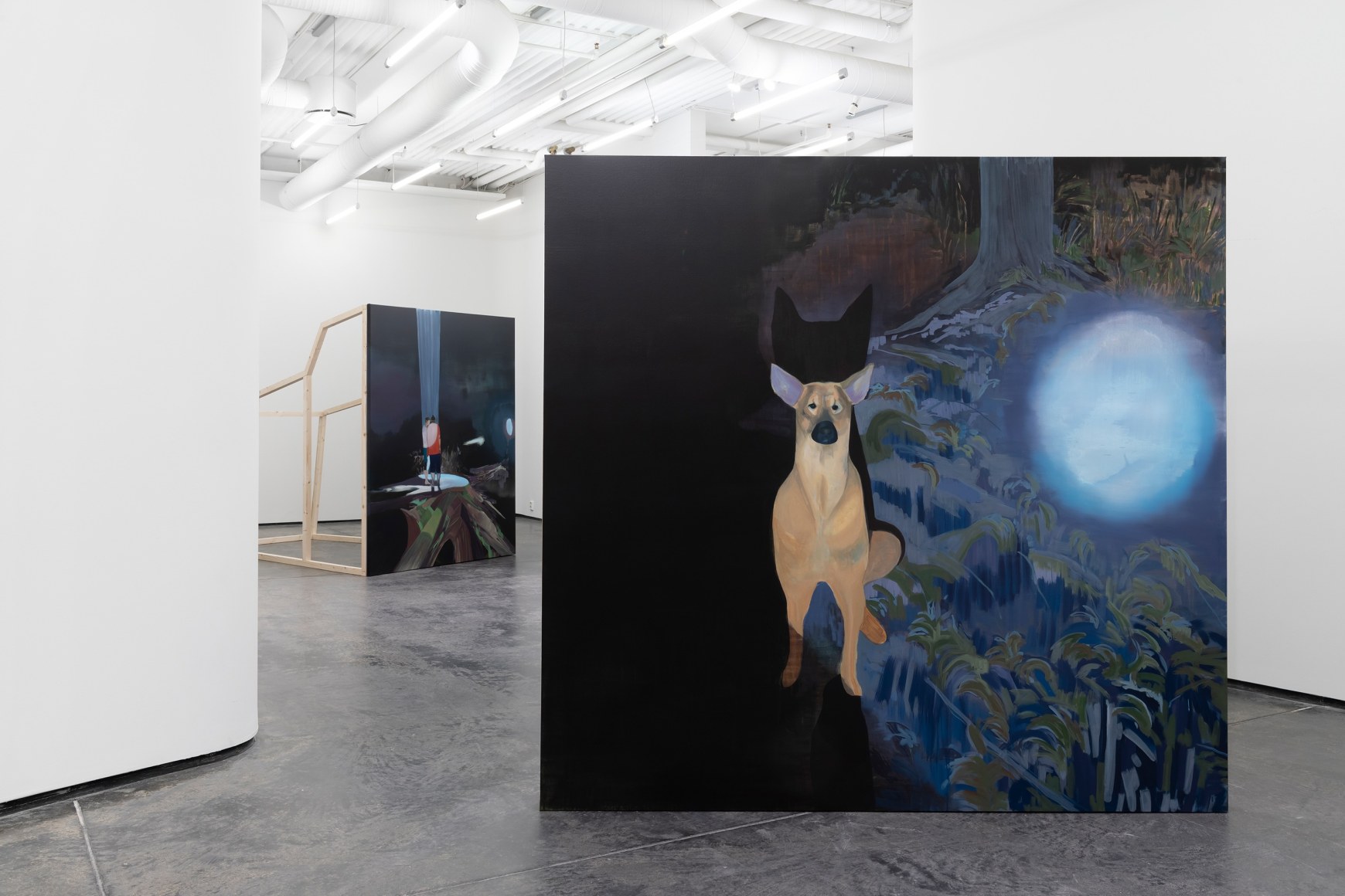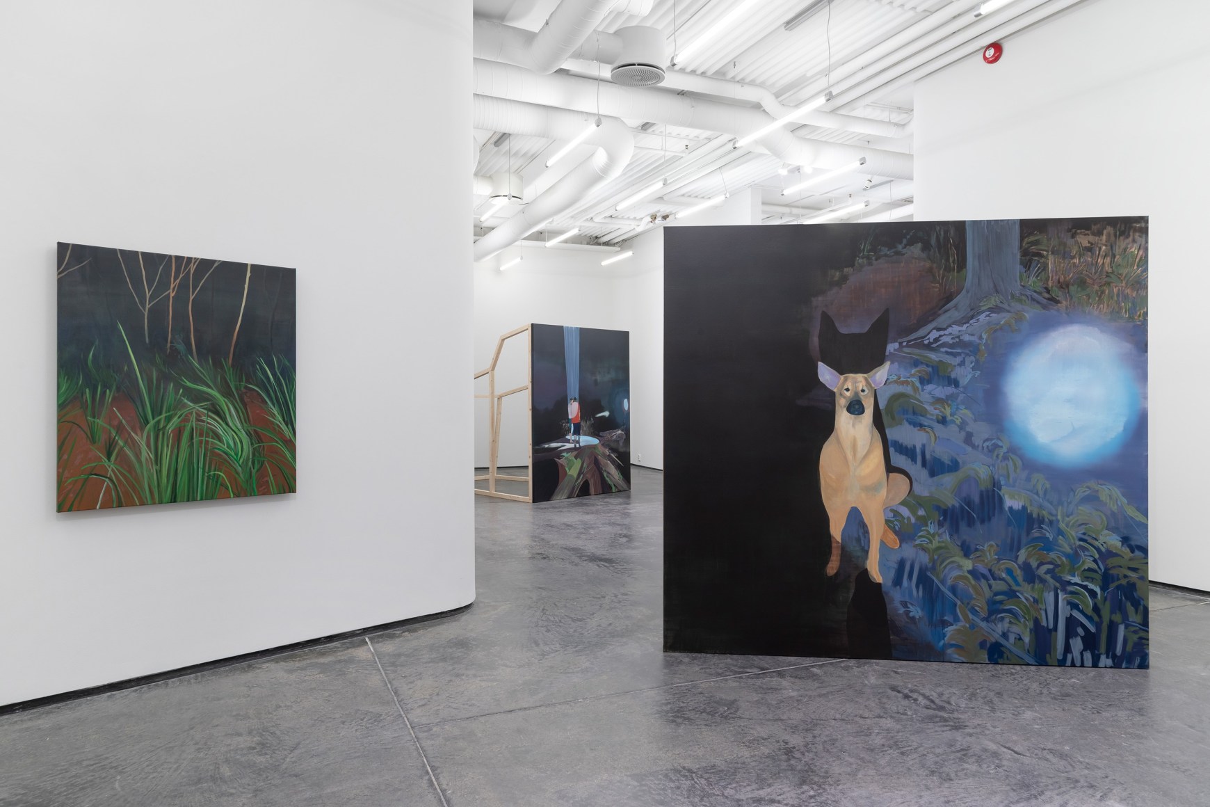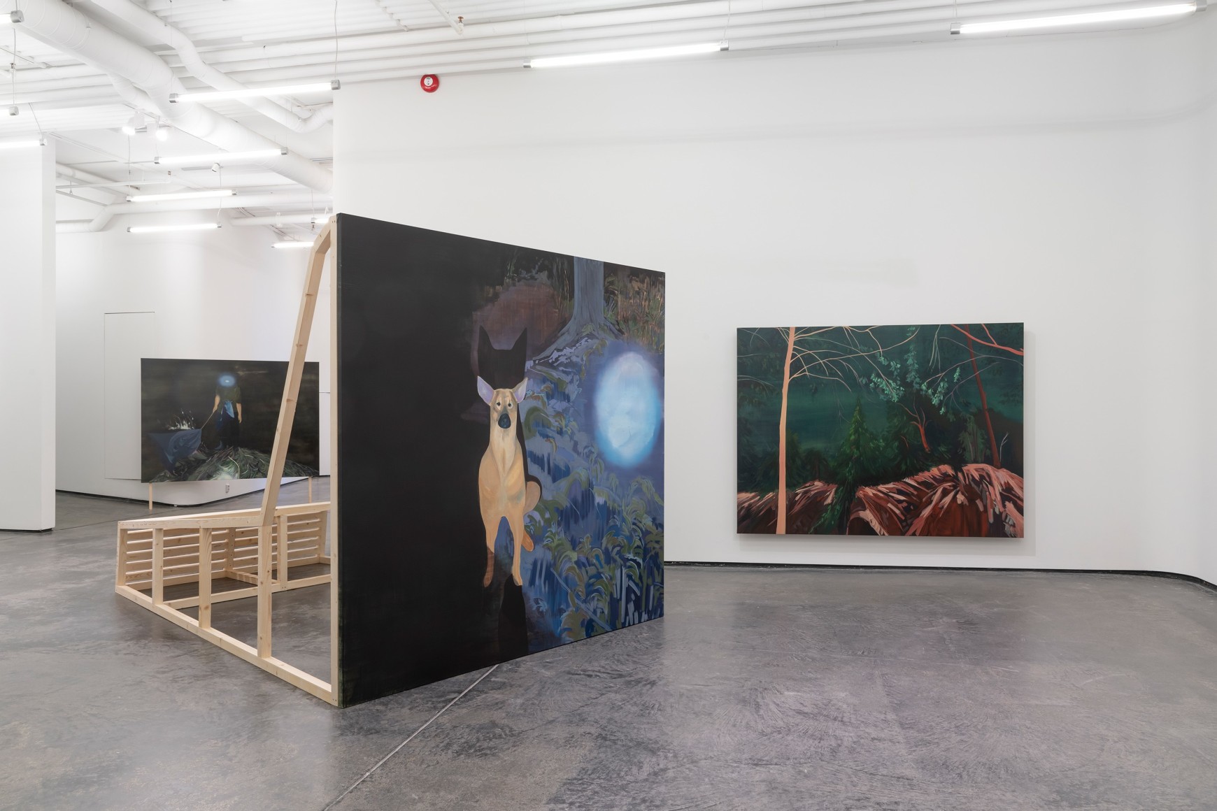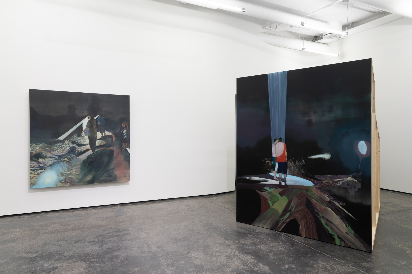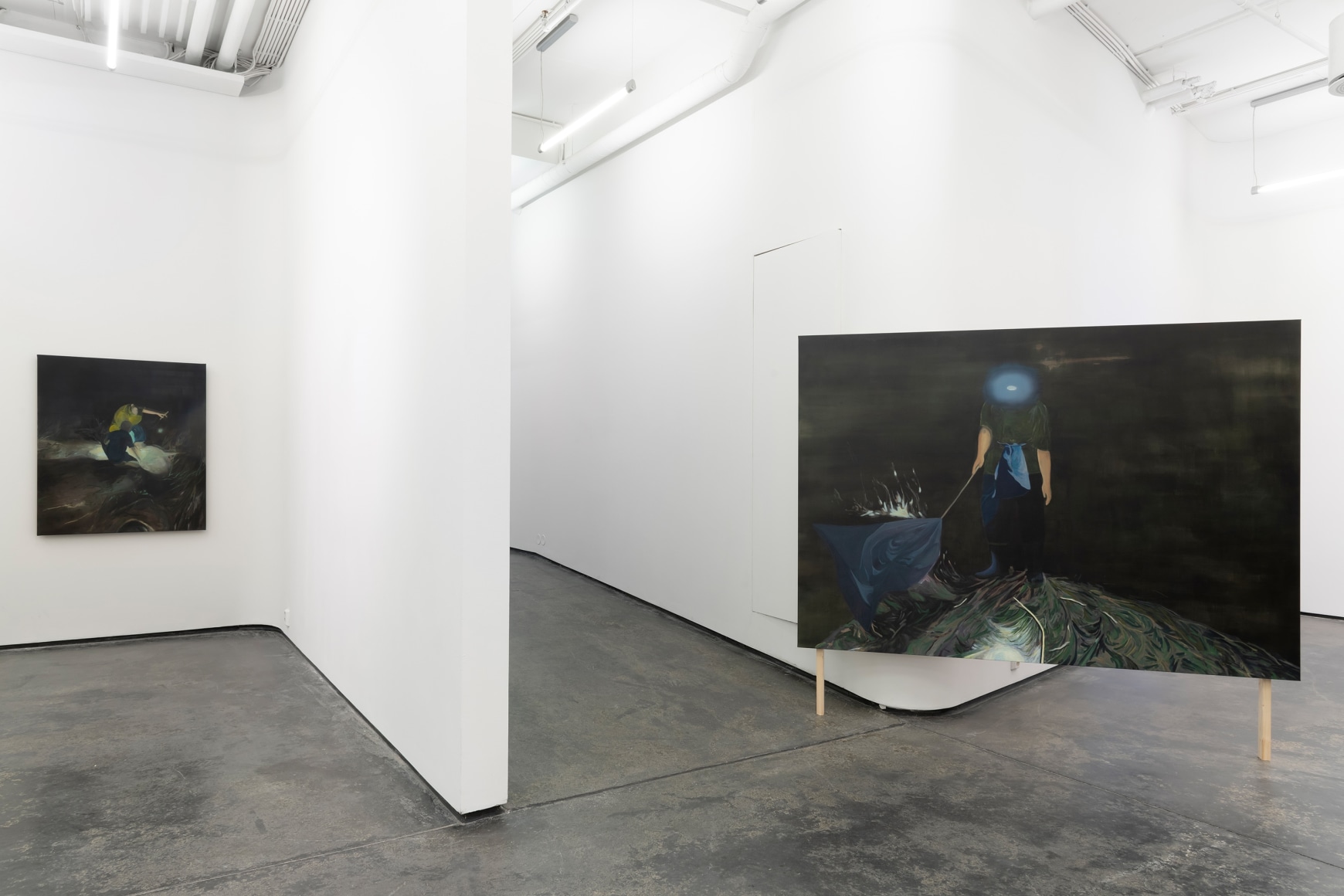 Wanthiang paints with thin, fast-drying acrylics, causing some surfaces to appear almost washed out and unexpectedly dry. Her motifs float on the canvas, and vegetation takes on anthropomorphic qualities. The humid landscapes depicted reveal strange elements, as if things lurk beneath the transparent yet oblique surfaces. In these recent paintings, people are looking for some things that we cannot see. The figures often appear as outlines or silhouettes and the light becomes the main character.