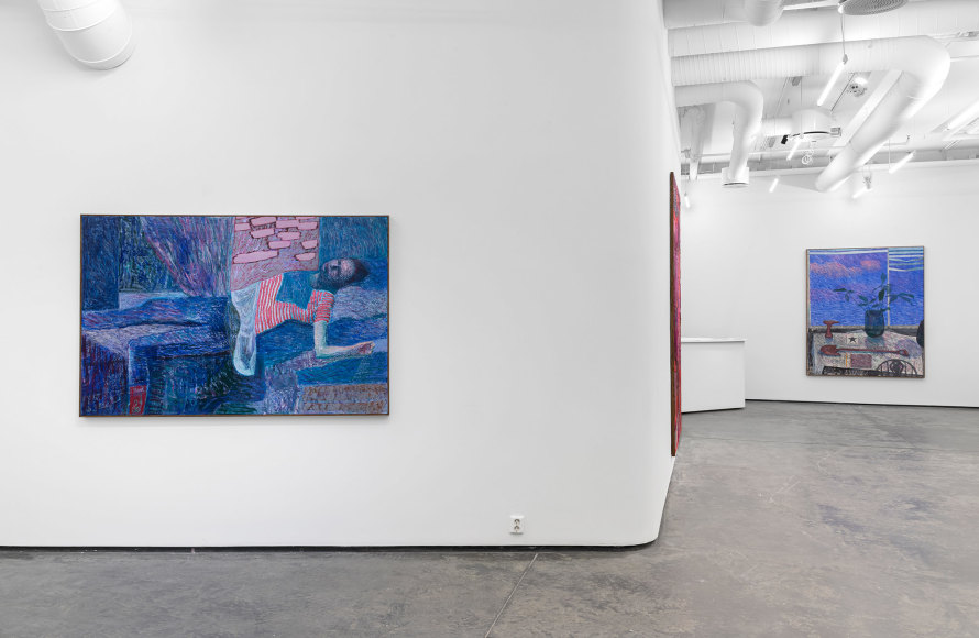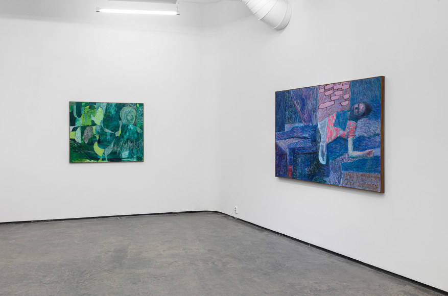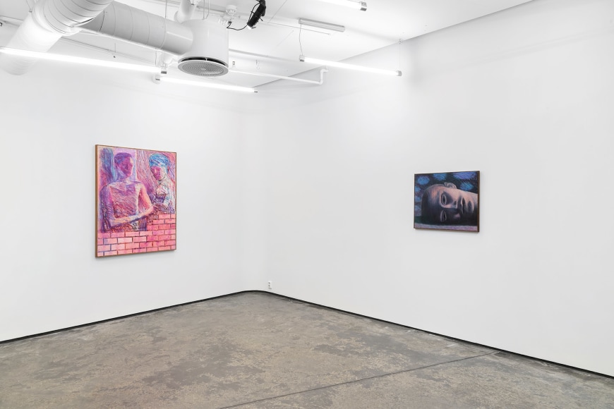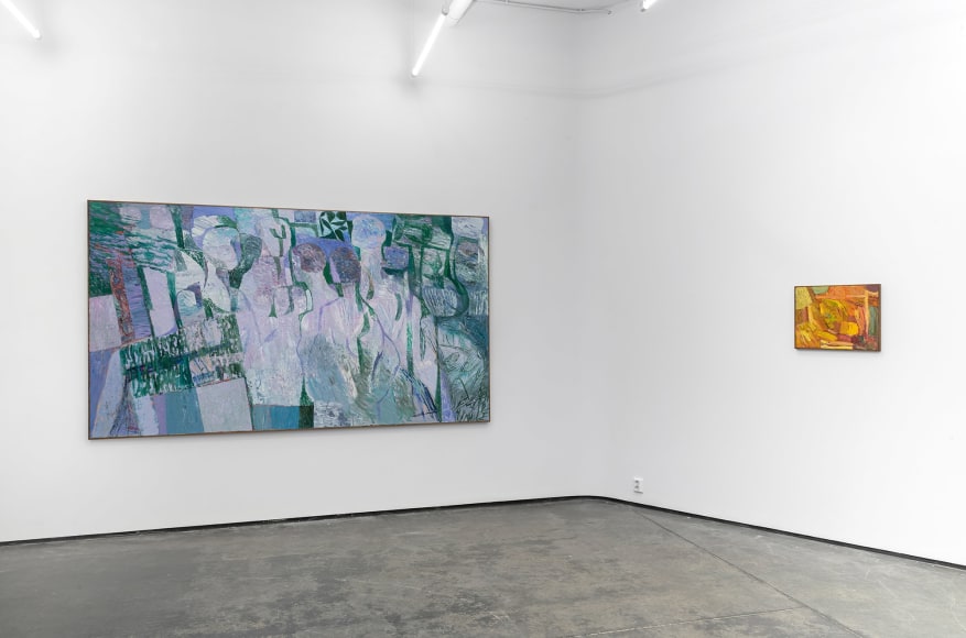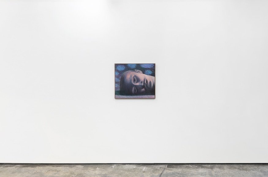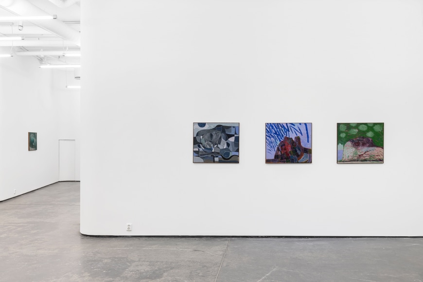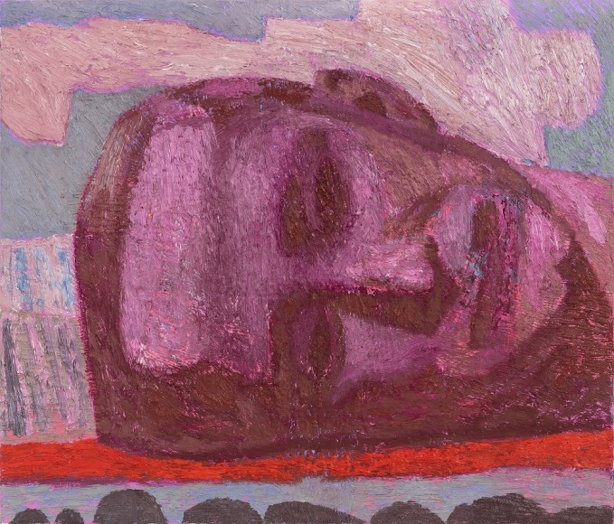 In the exhibition, which consists of 21 works, one can recognize a number of reoccurring subjects in Bjertnæs’ artistic universe; Adam and Eve’s expulsion from the Garden of Eden, contemplating portraits of his wife Hanna-Maria, and in this exhibition, the resting head. The resting heads appears in different shapes and colors throughout the exhibition, some are more obvious, some are morphed into landscapes while others disappear into an abstract play of patterns.