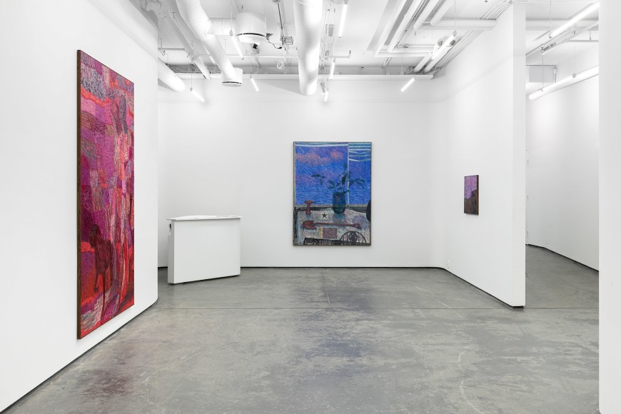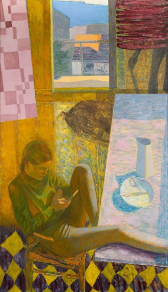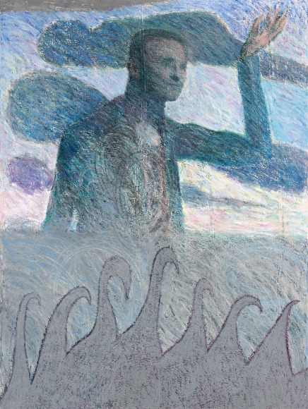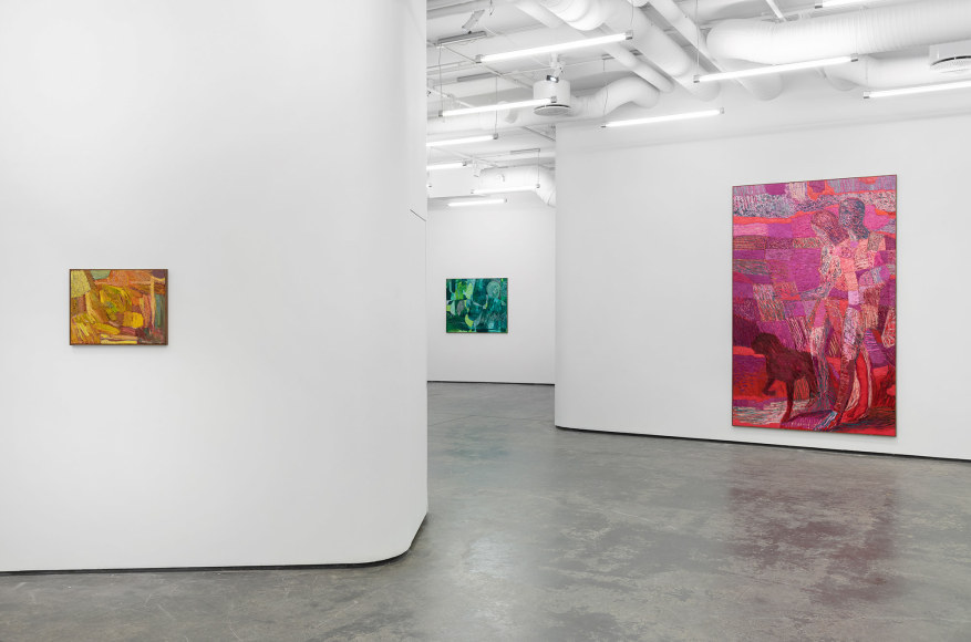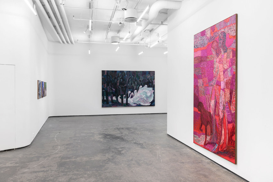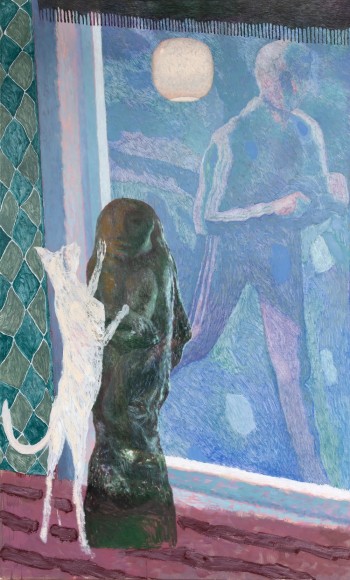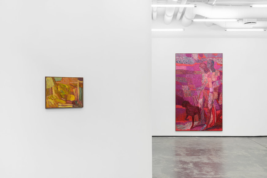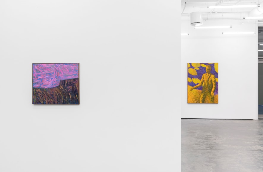 In the exhibition, which consists of 21 works, one can recognize a number of reoccurring subjects in Bjertnæs’ artistic universe; Adam and Eve’s expulsion from the Garden of Eden, contemplating portraits of his wife Hanna-Maria, and in this exhibition, the resting head. The resting heads appears in different shapes and colors throughout the exhibition, some are more obvious, some are morphed into landscapes while others disappear into an abstract play of patterns.