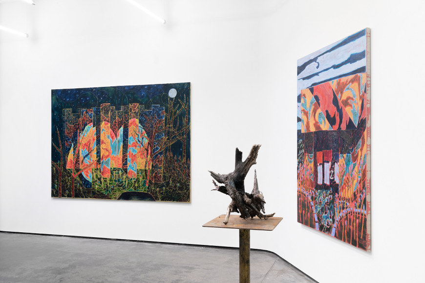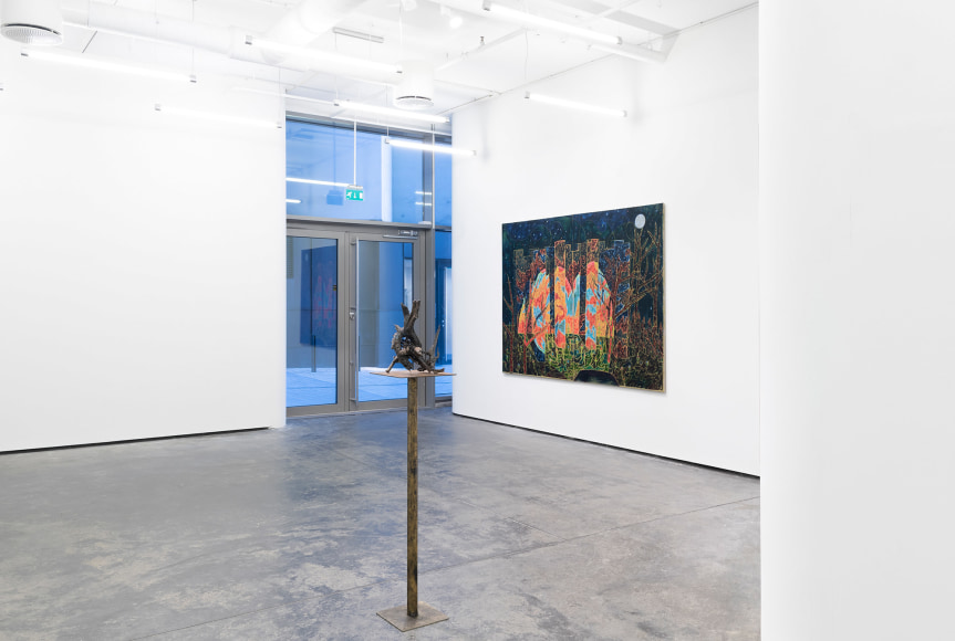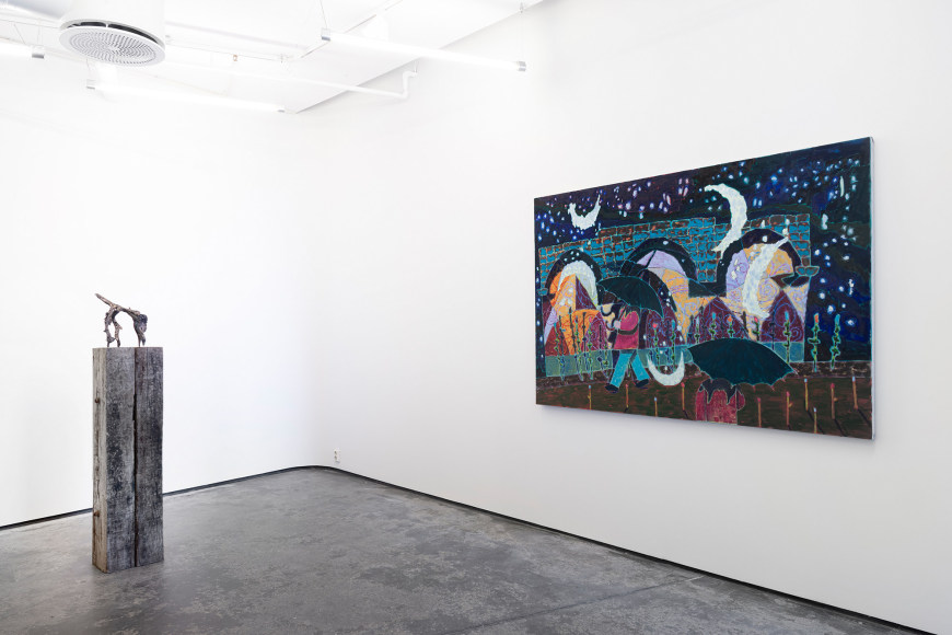 This new series presented in “Idun Baltzersen, Espen Kvålsvoll, Ada Nilsen” is connected to Kvålsvoll’s stay in Paris from May to September 2021. In his practice of processing a collection of motifs, the stay in France influenced how the artist perceived light and shadow, in different circumstances such as nights and sunny days. Kvålsvoll experienced the shade to be stronger in contrast to the sunlight in France than in Norway. This in turn resulted in a new approach to consider space and figuration in his art. His paintings are composed as scenes that work as an entrance to presenting motifs and objects as scenery in staged light. With his figurative approach, the scenes create room to play with drama through compositions.