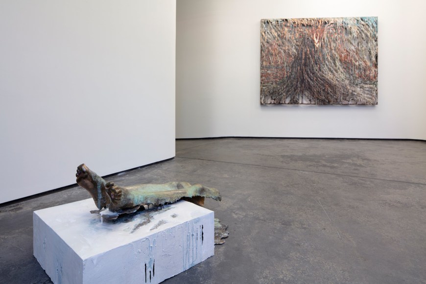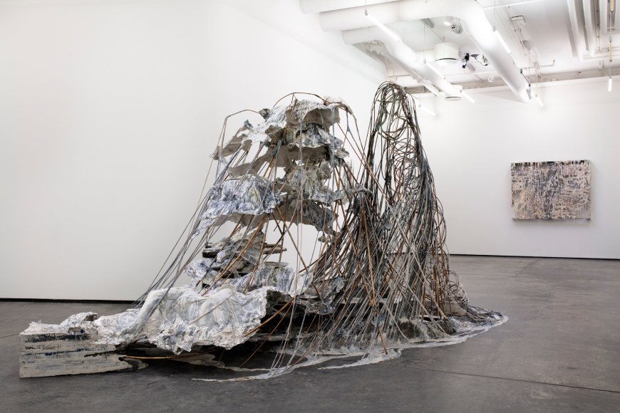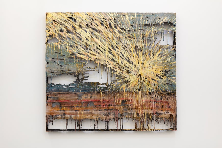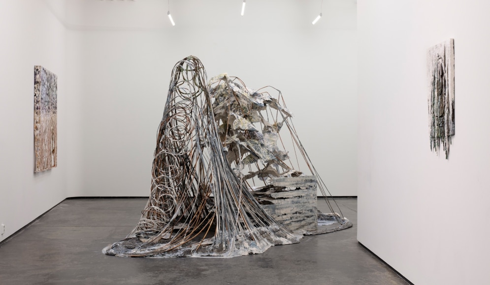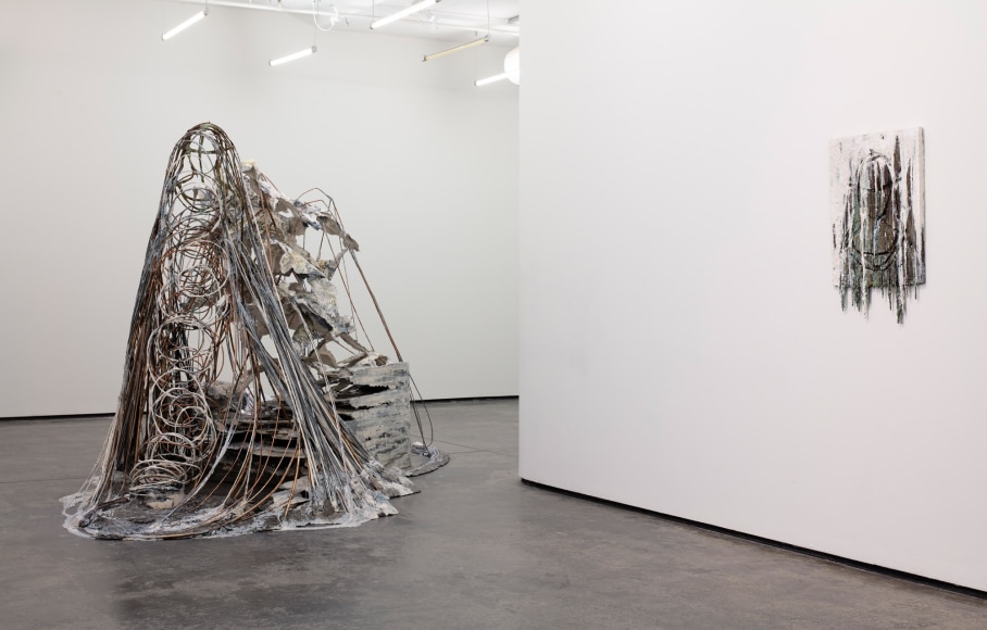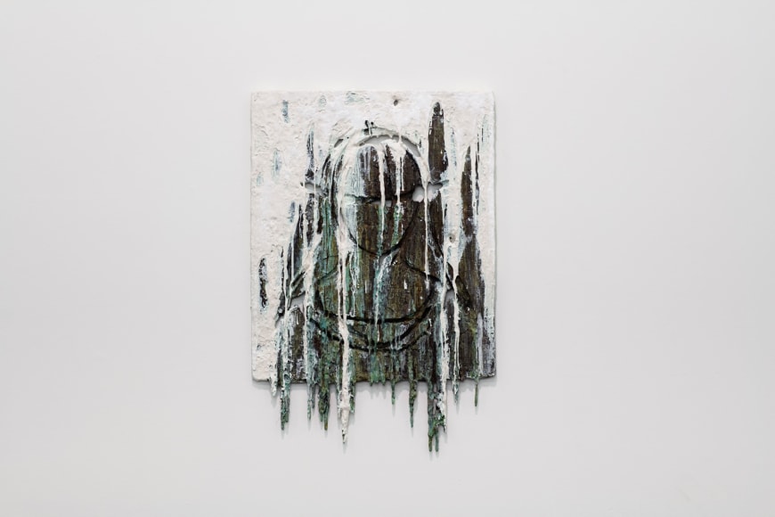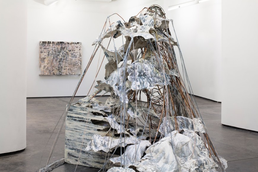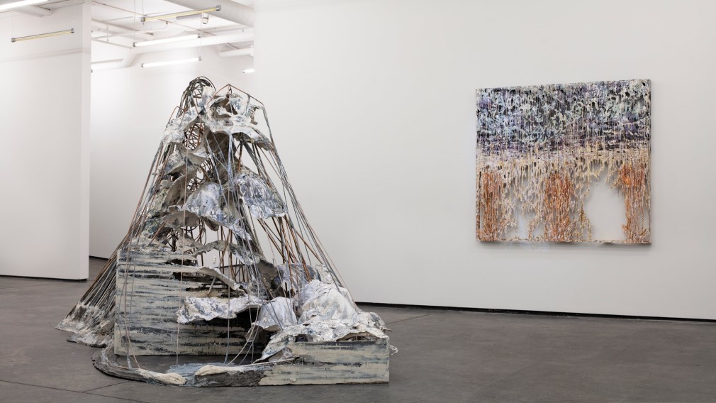 Al-Hadid is known for her elevated sculptures and wall panels which seems to melt or harden, caught in a chemical phase change from one state to the next. She has developed a unique process of using traditional and contemporary materials such as polymer gypsum, steel, plaster, fiberglass, wood, polystyrene, cardboard, wax, and paint. The wall panels balance somewhere between fresco and tapestry, they seem to almost float on the walls. The lofty sculpture showed in “Mock Sun” is also a reference to art from centuries past. The work is a second in a series of five large-scale sculptures that imagine a number of possible futures for the central figure in Hans Memling’s painting “Allegory of Chastity” (1475). The painting depicts a primly posed woman sitting inside the crest of a mountain, wearing the rock as a skirt, her hands politely folded in front. Freed from her mountainous “chastity belt” in this new sculpture, the jagged mountains are replaced by new landscapes and structures. These new propositions introduce both narrative and material developments as well as giving new life to the figure after the painting. Now that the female figure is free from her prior constraints, while surrounded by the volcanic and apocalyptic imagery of her panel work throughout the exhibition, one might pose the question: What happens when her volcano erupts? Where does she go?