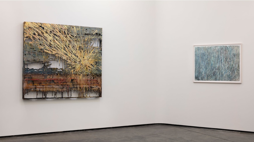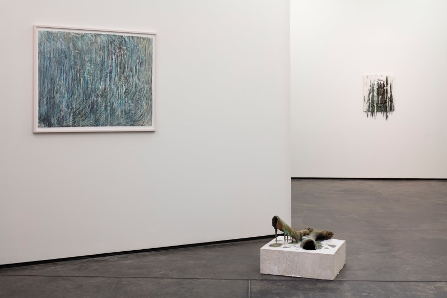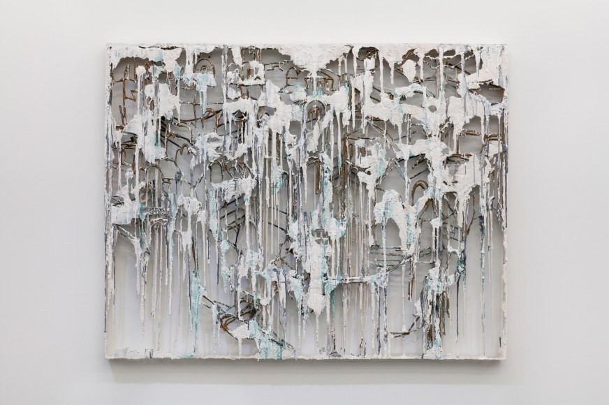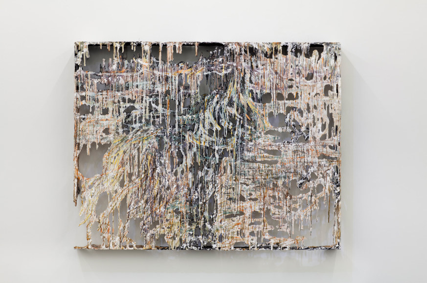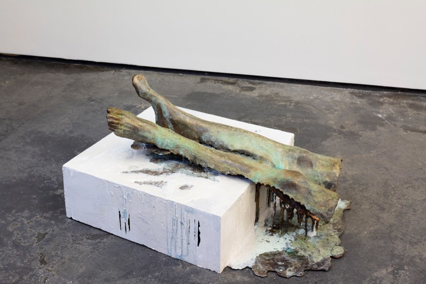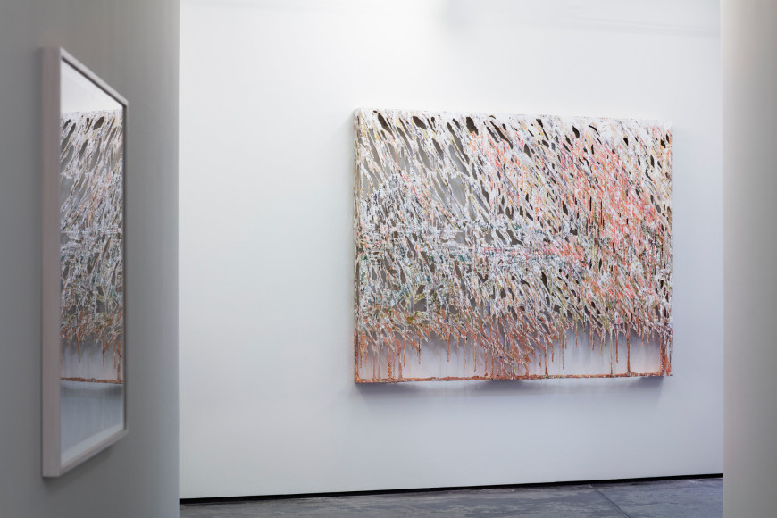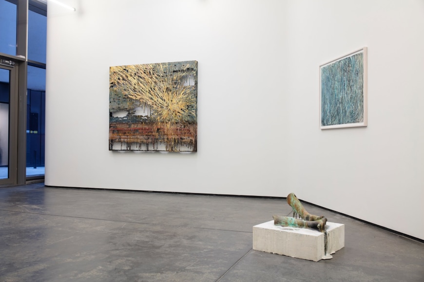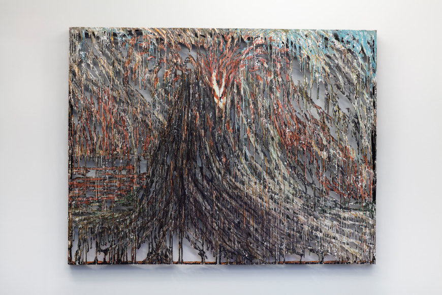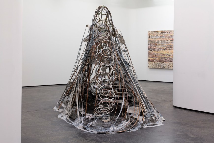 Al-Hadid is known for her elevated sculptures and wall panels which seems to melt or harden, caught in a chemical phase change from one state to the next. She has developed a unique process of using traditional and contemporary materials such as polymer gypsum, steel, plaster, fiberglass, wood, polystyrene, cardboard, wax, and paint. The wall panels balance somewhere between fresco and tapestry, they seem to almost float on the walls. The lofty sculpture showed in “Mock Sun” is also a reference to art from centuries past. The work is a second in a series of five large-scale sculptures that imagine a number of possible futures for the central figure in Hans Memling’s painting “Allegory of Chastity” (1475). The painting depicts a primly posed woman sitting inside the crest of a mountain, wearing the rock as a skirt, her hands politely folded in front. Freed from her mountainous “chastity belt” in this new sculpture, the jagged mountains are replaced by new landscapes and structures. These new propositions introduce both narrative and material developments as well as giving new life to the figure after the painting. Now that the female figure is free from her prior constraints, while surrounded by the volcanic and apocalyptic imagery of her panel work throughout the exhibition, one might pose the question: What happens when her volcano erupts? Where does she go?