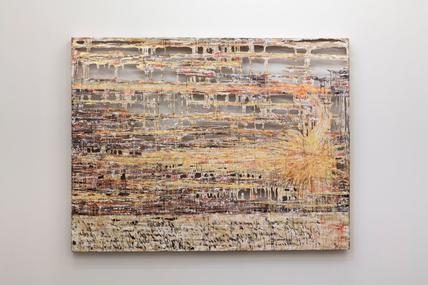 The title of Al-Hadid’s exhibition, “Mock Sun”, is derived from the artist’s recent encounter of a parahelio, a natural phenomenon in which the sky suddenly displayed three suns. Upon researching this magical sight, Al-Hadid discovered the German 16th-century manuscript, “The Book of Miracles,” which depicts in rich luminous detail, a collection of illustrations of unexplained natural celestial phenomenon including parahelios, blood rains, insect invasions, and comets carrying swords. The manuscript is a spectacular discovery for Renaissance art that reflects apocalyptic anxieties that emerge during times of dramatic cultural shifts. Bold paintings that illustrate a host of unexplained astronomical visions with mythological and religious narratives alike, presented as a scientific treatise. The book has been a direct inspiration for the artist but has been altered and transformed through Al-Hadid’s technique and process. However, the subject matter is the same and always relevant; humankind’s everlasting immutable longing for grace, for mercy, and for the miraculous.