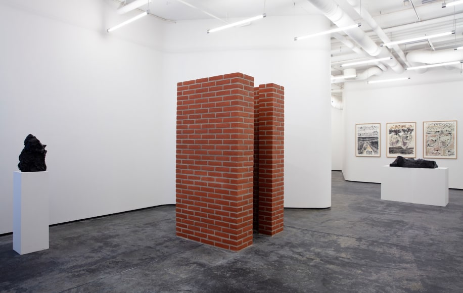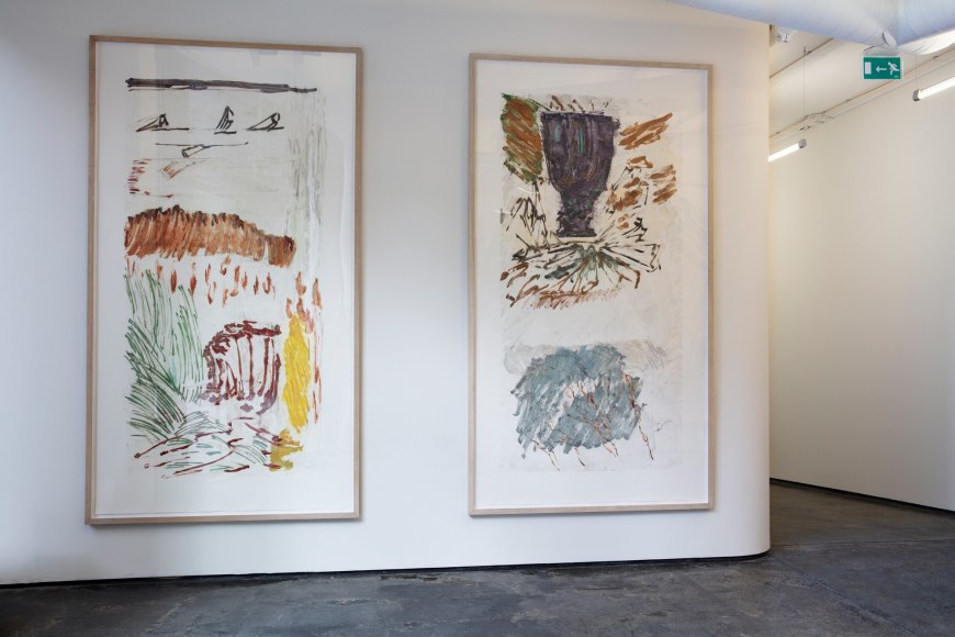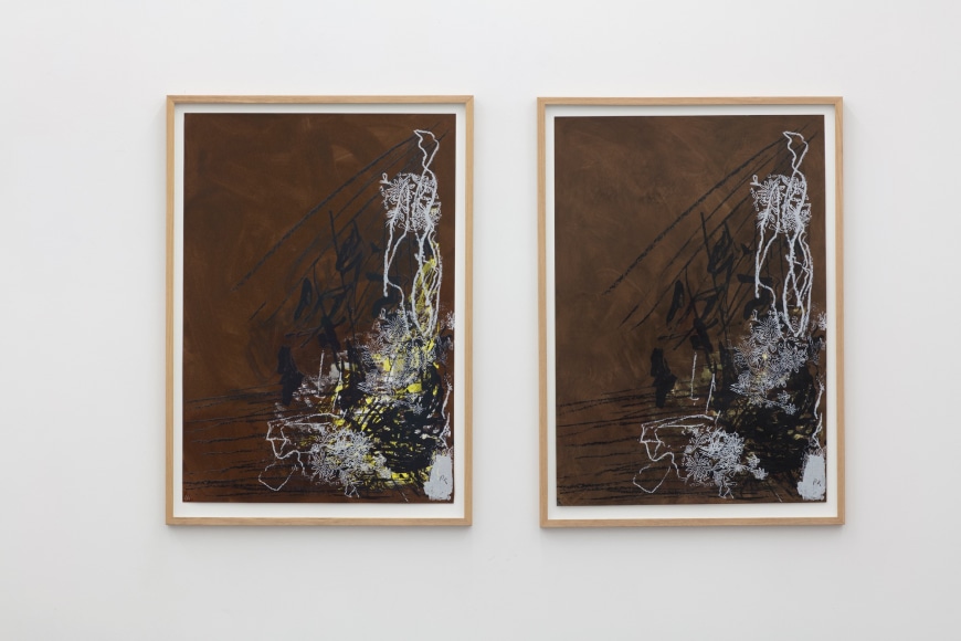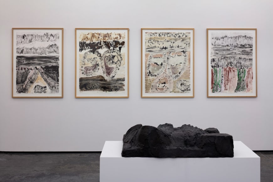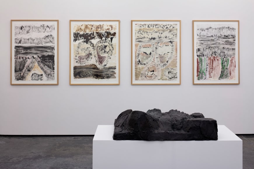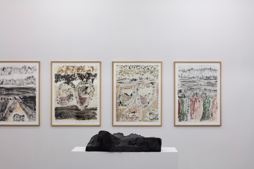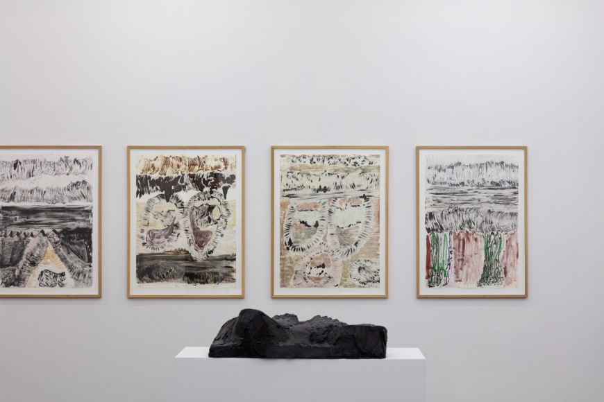 Kirkeby studied geology at University of Copenhagen, of which he gained a Masters degree in 1964, by this time he was already a member of the Experimental School (of Arts), compromised of committed avant-gardists grouped around the artist Poul Gernes. During his many early field trips within geology, Per Kirkeby experimented with watercolors and drawings, an attest to his interest in visualizing nature partly through a geological lens that continued throughout his career, evident in the works showed in this exhibition. His works varied between abstraction and landscape, often within the same canvas, though retaining an organic palette throughout. Comparably, his bronze sculptures, which he started making in the early 80s, are both abstract lumps and depictions of rocks he studied on the geology field trips he made throughout his life.