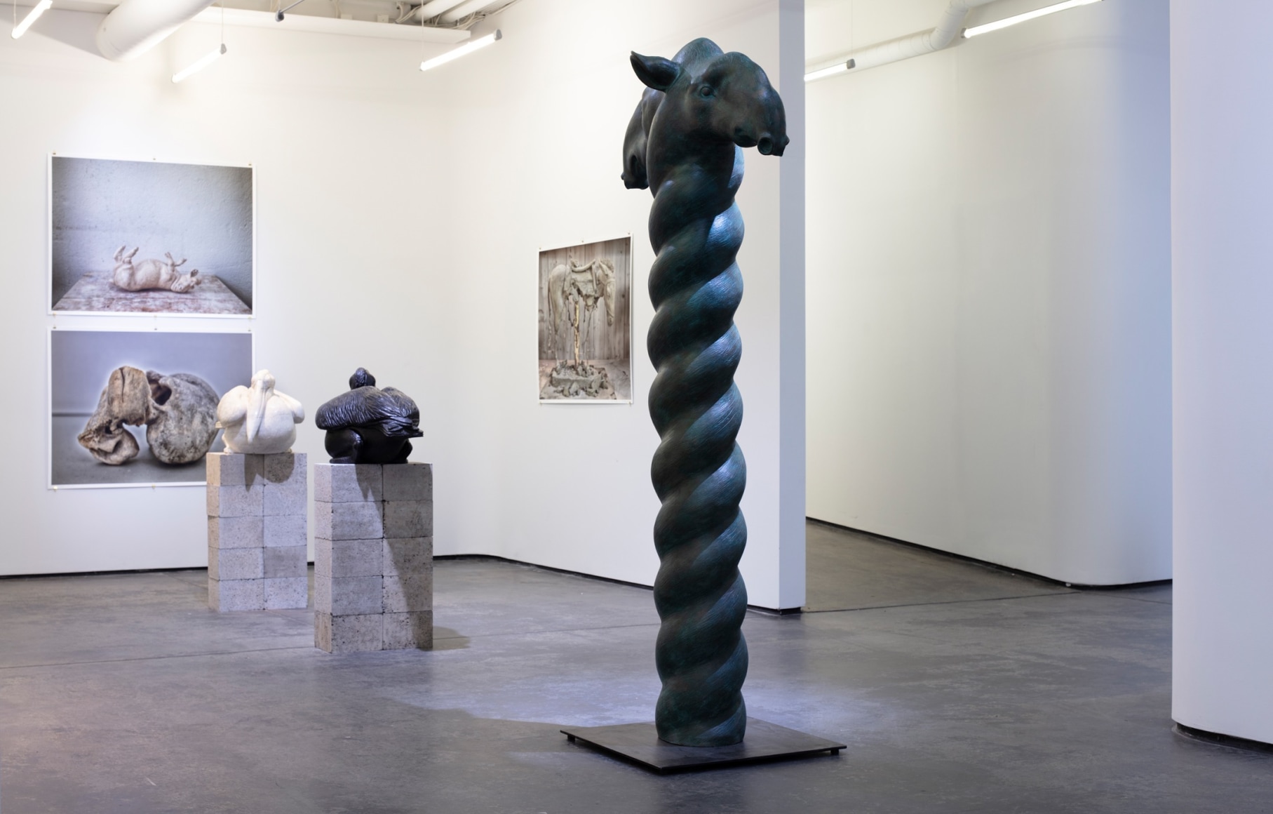 The way Maning and Engelsen pursue to portray animals in their natural surrounding habitats; Maning wanted to portray Engelsen’s sculptures in her studio in the same manner. In the gallery space art is actually taken out of their original context, away from its creative process. In Maning’s photos, one can see the sculptures on the workbench, mixed together with other sculptures, side by side with the sculptor’s heavy tools.