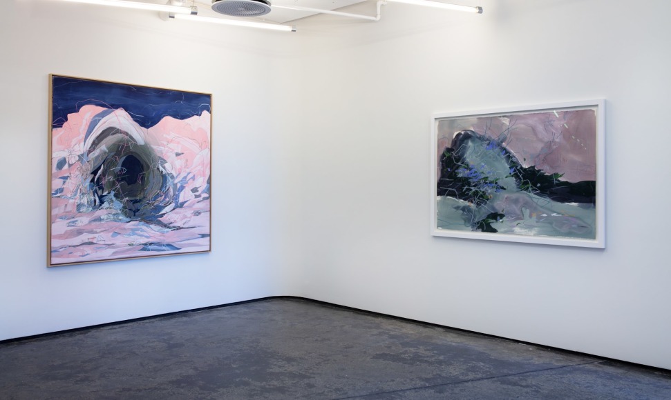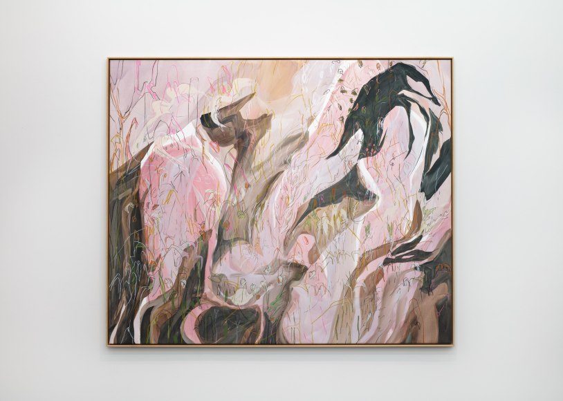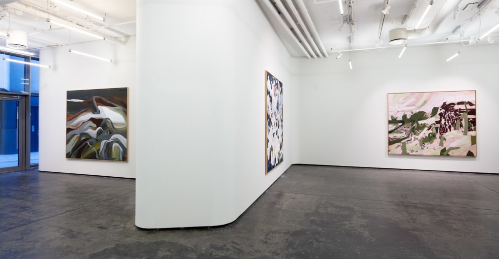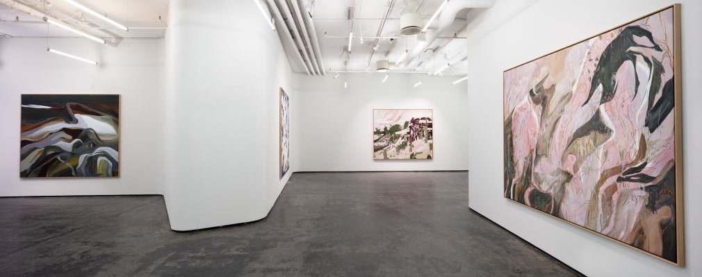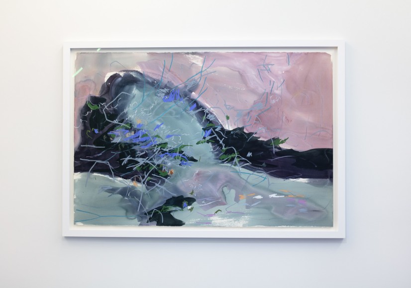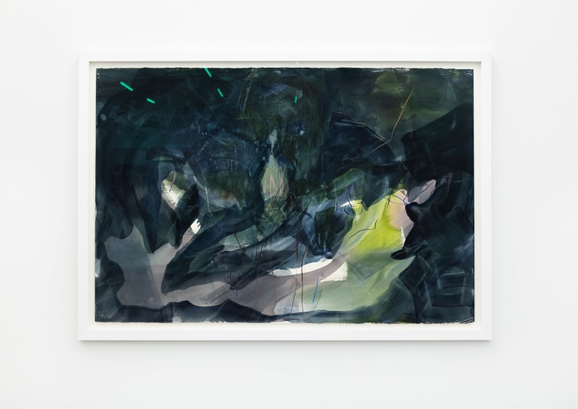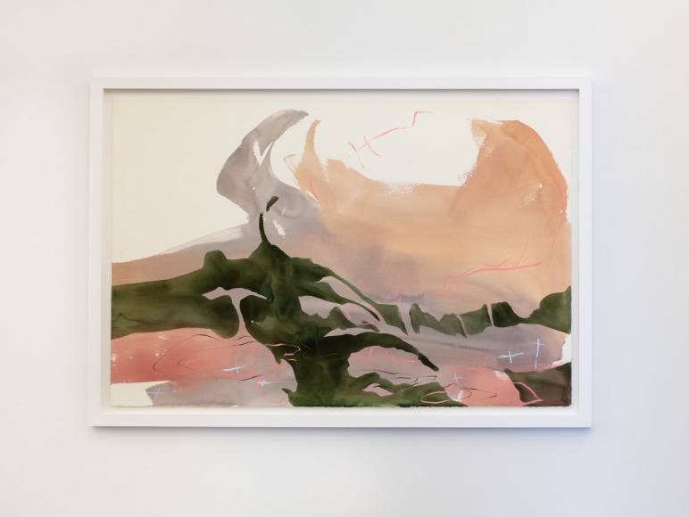 Tschäpe’s carefully nuanced canvases and drawings include imageries evocative of the natural world, suggesting growth, transition, and metamorphosis. Her continuing fascination with water and admiration of its endless possibilities of transformation manifests in the exhibition. The title “Walking Mountains and Dancing Swamps” hints towards elements of aquatic life and organic shapes, creating a universe of sublime landscapes that shifts between image, fantasy, and abstraction. With her work, she points more towards a sort of topology, sites of deterritorialization, free spaces with no national or cultural lines of differentiation.