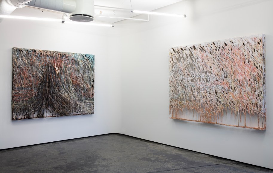 Al-Hadid is known for her elevated sculptures and wall panels which seems to melt or harden, caught in a chemical phase change from one state to the next. She has developed a unique process of using traditional and contemporary materials such as polymer gypsum, steel, plaster, fiberglass, wood, polystyrene, cardboard, wax, and paint. The wall panels balance somewhere between fresco and tapestry, they seem to almost float on the walls. The lofty sculpture showed in “Mock Sun” is also a reference to art from centuries past. The work is a second in a series of five large-scale sculptures that imagine a number of possible futures for the central figure in Hans Memling’s painting “Allegory of Chastity” (1475). The painting depicts a primly posed woman sitting inside the crest of a mountain, wearing the rock as a skirt, her hands politely folded in front. Freed from her mountainous “chastity belt” in this new sculpture, the jagged mountains are replaced by new landscapes and structures. These new propositions introduce both narrative and material developments as well as giving new life to the figure after the painting. Now that the female figure is free from her prior constraints, while surrounded by the volcanic and apocalyptic imagery of her panel work throughout the exhibition, one might pose the question: What happens when her volcano erupts? Where does she go?