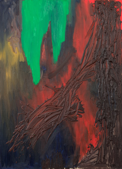 Wyller’s paintings lie somewhere between ideas around Impressionist landscapes, actual landscapes and abstract expressionism. Her paintings are comprised of different materials, often layered - including textiles, such as curtains and furniture textiles, along with stone, cardboard mash, plaster. Wyller further works with different types of wax, microcrystalline, beeswax, that is, which she paints encaustic with hot wax and cold wax.