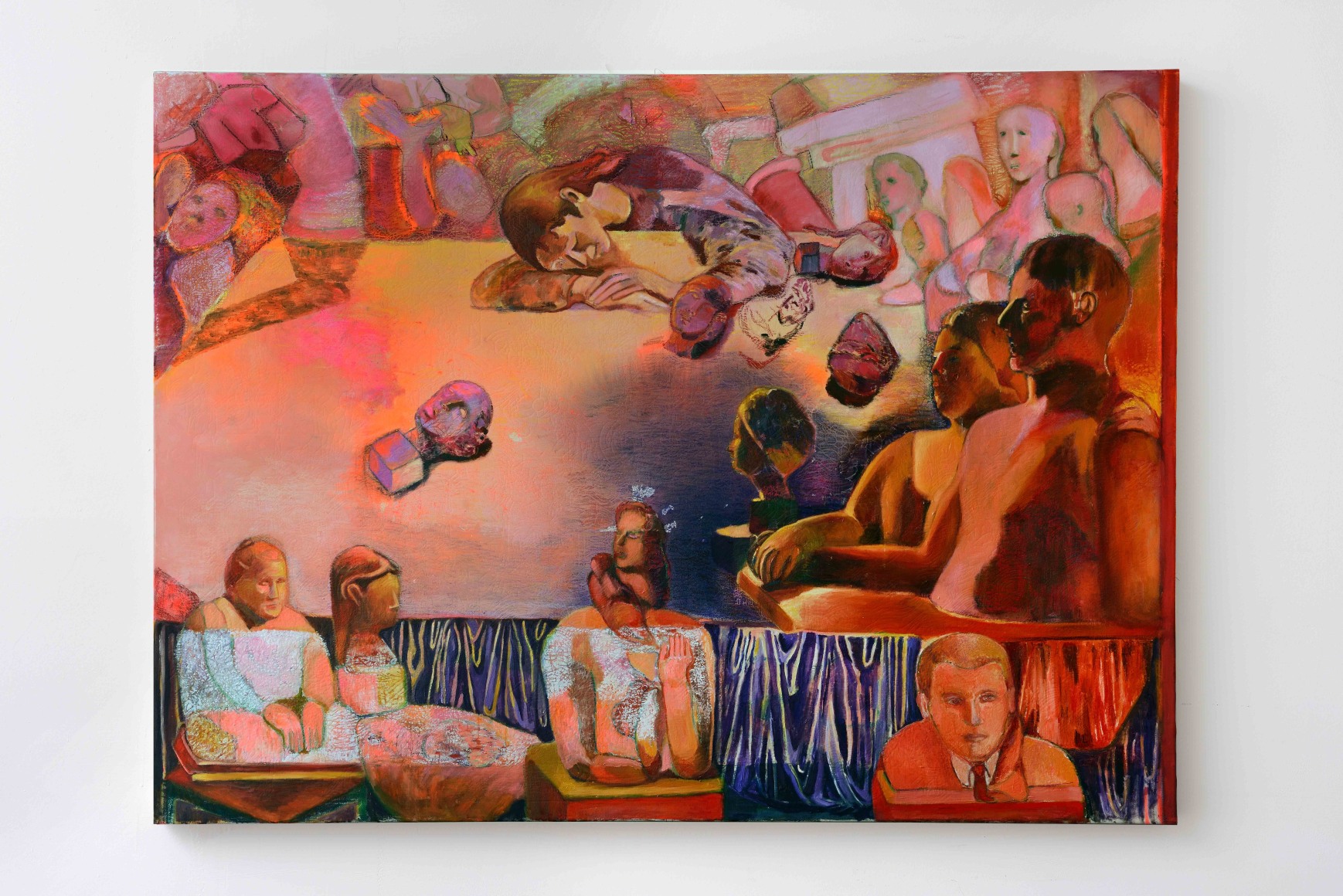 The show is made of 17 paintings, and is split into 2 segments. The first is painted traditionally with oil painting on canvas, while the second is characterised by stitched canvases, worked with several layers of color.