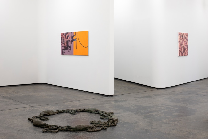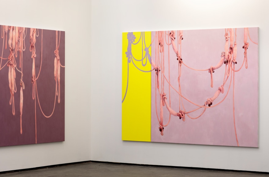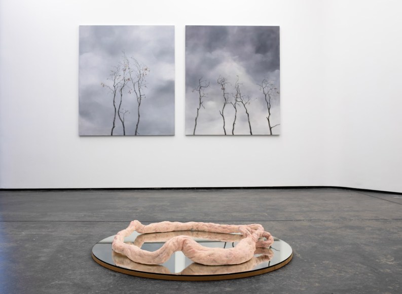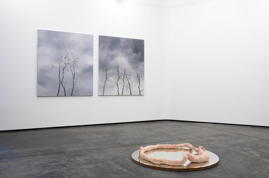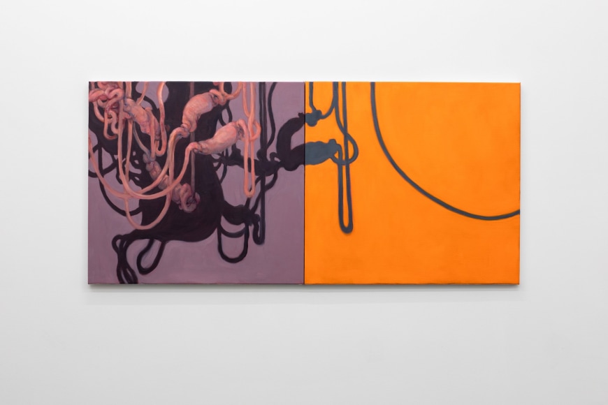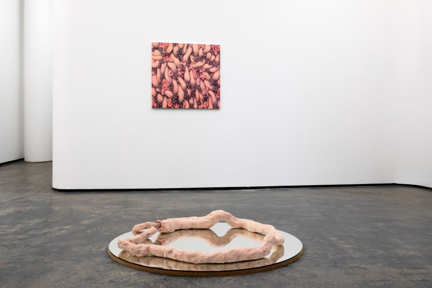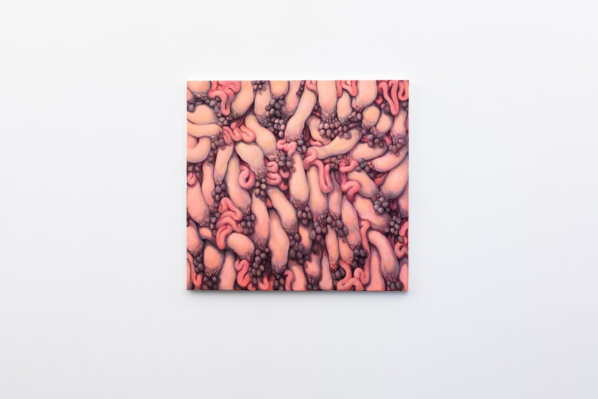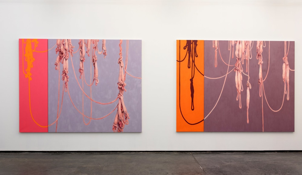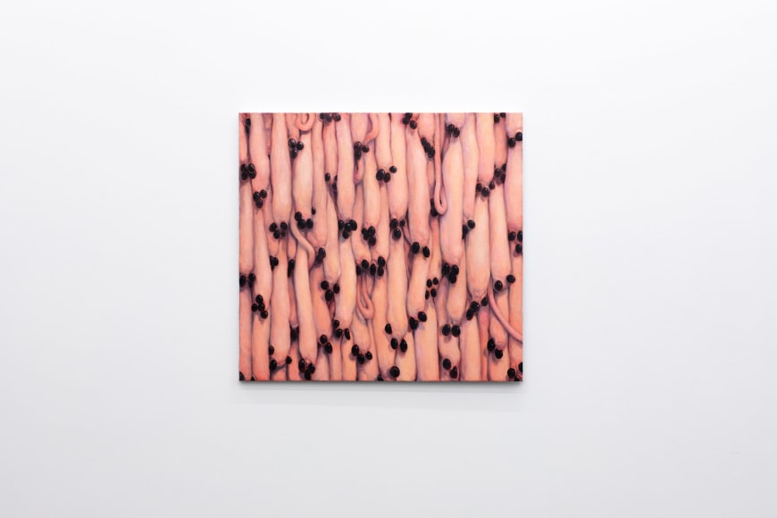 Amongst portraits of humans and nature, are a series of unidentifiable intestines, gleefully and distortedly displayed on bright coloured canvases. This series summarizes and binds the further works of the exhibition and reminds us of Kvium´s dystopian outlook on the mind and future of the human race. That we have now reached a “Point of No Return” and what is left is complete helplessness masked by a cheerful ignorance. The title of the exhibition “Point of No Return” refers to an indescribable moment, when we are close to infinity. A moment between what was, and what is to come which will always be a “point of no return”, and there is no way to go back, but are forced to float on into an eternal fog in time and space. As time is infinite, we will not be able to grasp this moment and give it the extent it warrants.