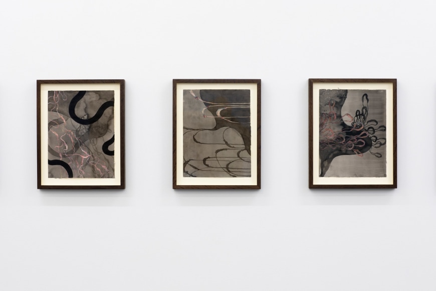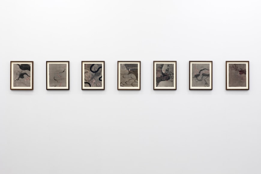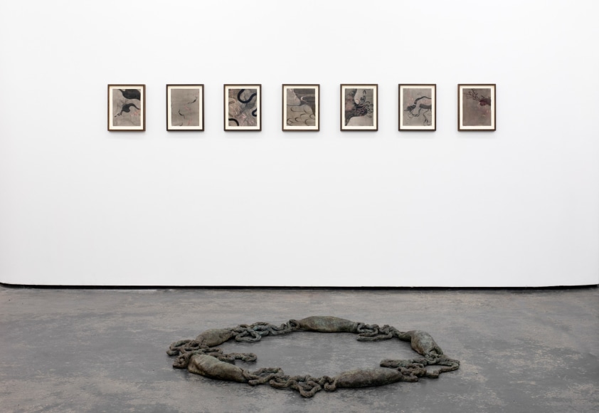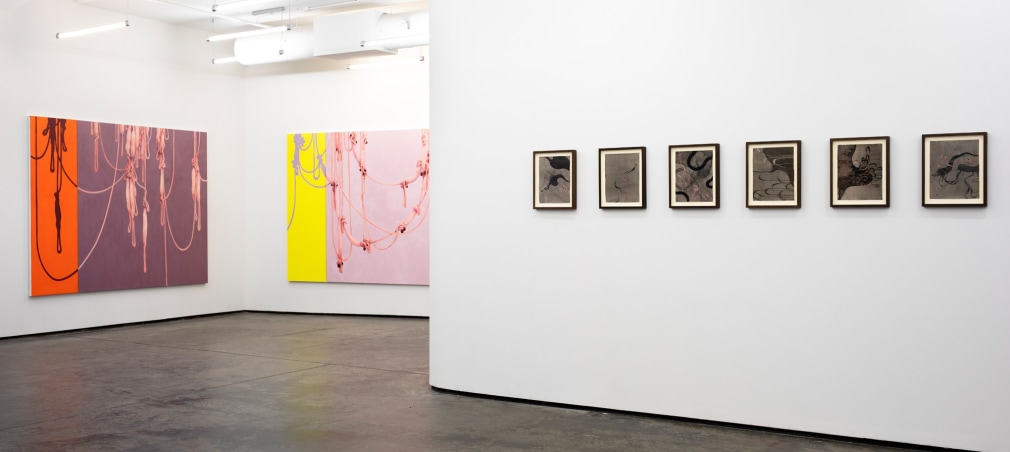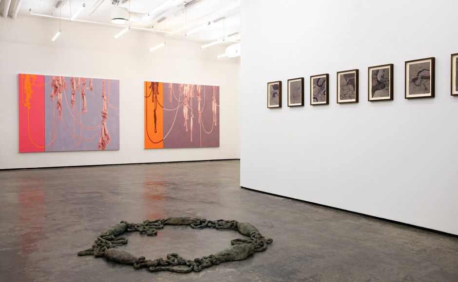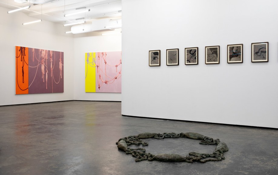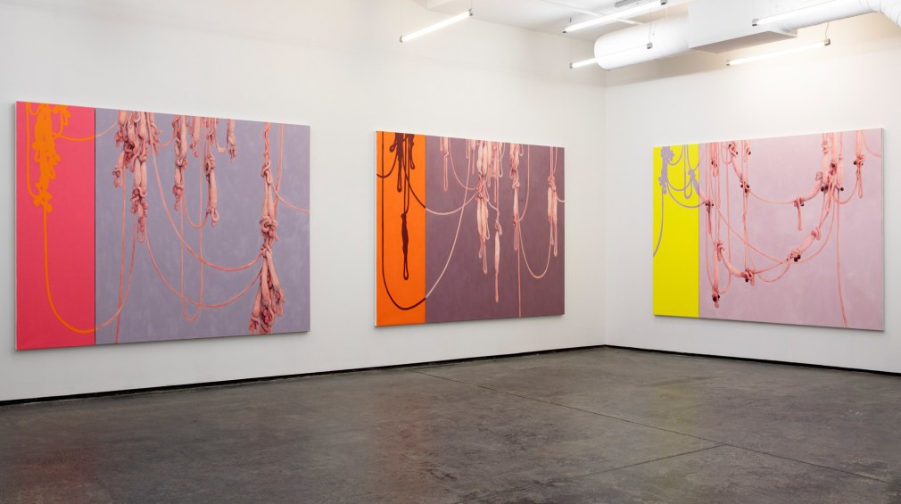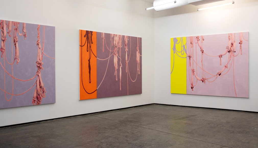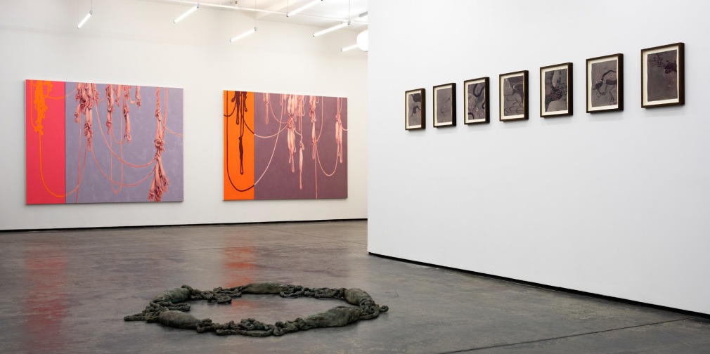 Amongst portraits of humans and nature, are a series of unidentifiable intestines, gleefully and distortedly displayed on bright coloured canvases. This series summarizes and binds the further works of the exhibition and reminds us of Kvium´s dystopian outlook on the mind and future of the human race. That we have now reached a “Point of No Return” and what is left is complete helplessness masked by a cheerful ignorance. The title of the exhibition “Point of No Return” refers to an indescribable moment, when we are close to infinity. A moment between what was, and what is to come which will always be a “point of no return”, and there is no way to go back, but are forced to float on into an eternal fog in time and space. As time is infinite, we will not be able to grasp this moment and give it the extent it warrants.