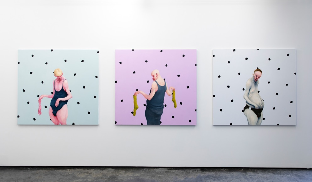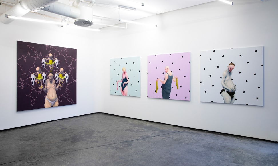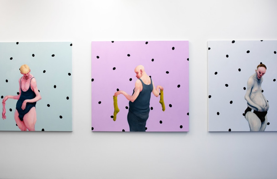 With expressions both tragicomic and grotesque, a part of the exhibition “Point of No Return” is a series of paintings of uncompromising portraits of foolish mankind and our existential conditions of life. Kvium addresses existential themes of being human through his characteristic figurative imagery. His familiar androgynous and deformed figures represent a view of humanity that concerns us all irrespective of sex, age and social capacity. He confronts the spectator, often by creating a sense of mirroring, with uncompromising portrayals of aspects of life that we rather hide, than expose to observation. Wrapped in stereotypes, the people portrayed in Kvium´s portraits further challenge the viewer with a paradoxical feeling of horror and fascination of the hideous and of nothingness. The result is a fear of emptiness, and a lack of meaning or being, which creates the foundation of a sublime redemption when experiencing his work.