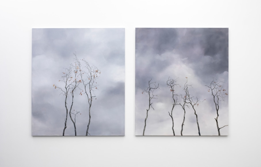 In the painting “Gray Day View II” Kvium transfers his depiction of human traits of stretched limps and overdone features to nature. The way he portrays the trees are similar to his human portraits; though not alone, they are isolated and lonely. In similar tradition to the Romantic Area, “Gray Day View II” reflects human feelings onto portrayals of nature; vast and powerful, inspiring, terror and awe.