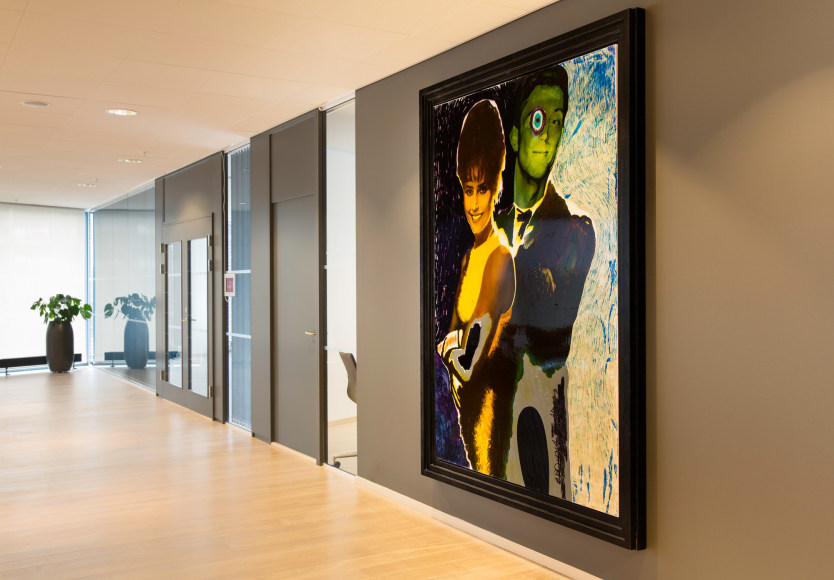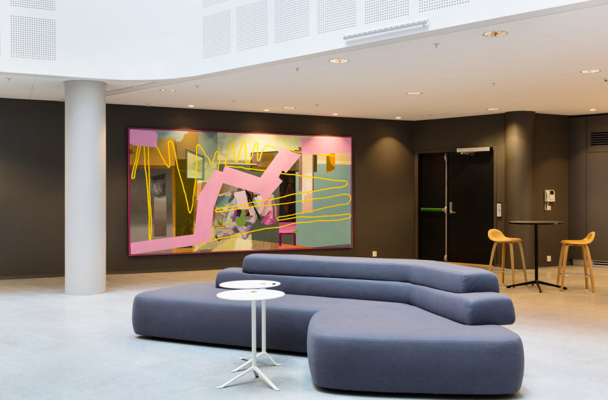 The focus on the media industry has therefor been of great importance in selections of artists, as well as the new architectural preconditions. For the public lounge area, the painting Essence II (2014) by the artist Christer Glein stretches out 4 meters on one of the extensive walls. The work signifies the artists’ way of working with the formal distinction between realism and abstraction. On the vast surface of the canvas, Glein plays with the potential of painting itself, in layers upon layers of bright colors in light brushstrokes and hard-edged geometric shapes.