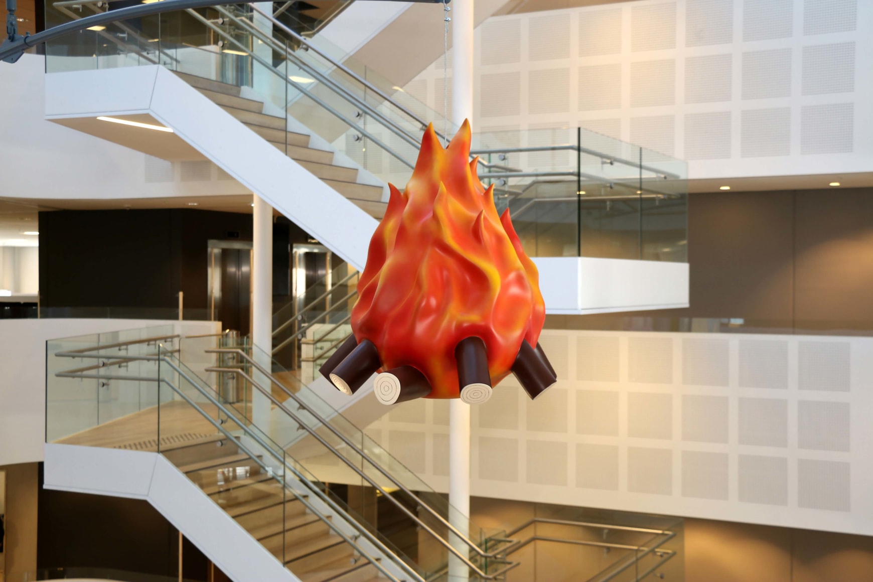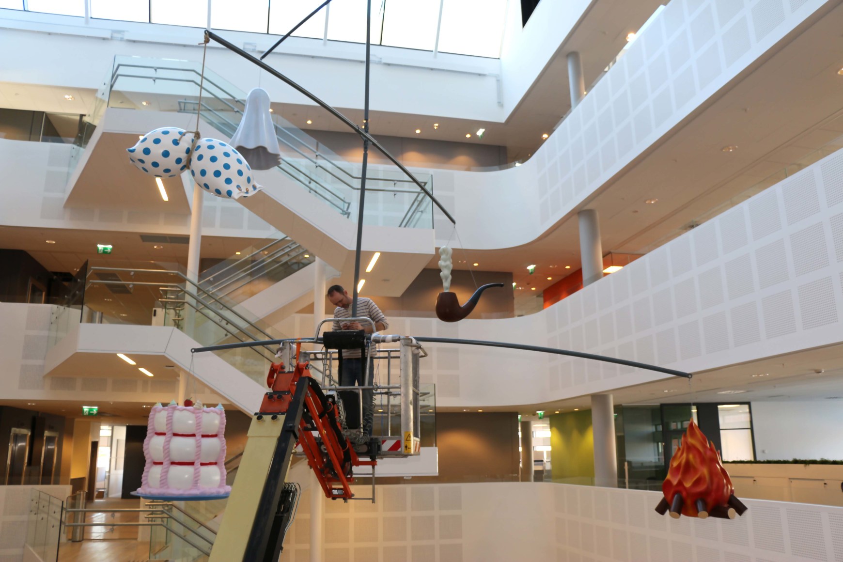 Fredrik Raddum is recognized for his sculptures and installation art, and has made a monumental piece for the public lounge area of the Aller building. The installation is shaped as a baby cot mobile with hanging sculptures resembling a dystopian cartoon. Its various levitations creates a visual experience for the entire business stationed different floors.