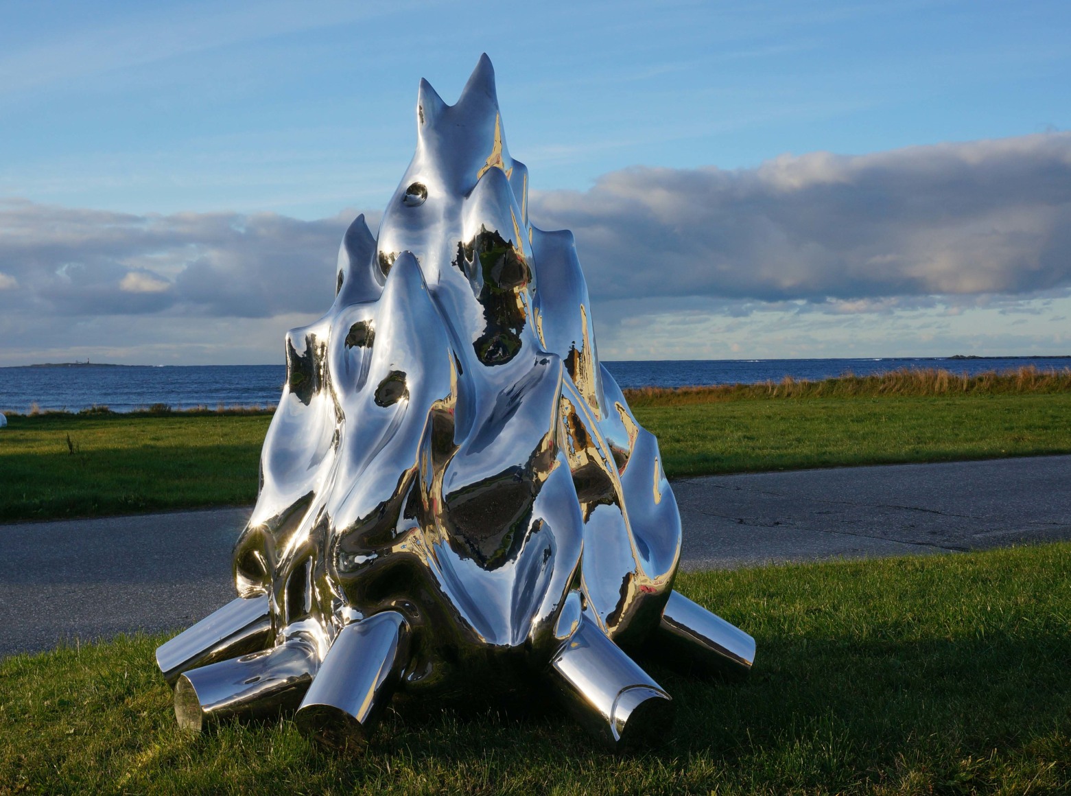 A campfire is a traditional outdoor gathering point, as well as a historically vital source of warmth and light. By eliminating the heat and life from the fire, Fredrik Raddum has created a monument that exceeds its concept and what is left is the lifeless symbol of a campfire. The sculpture is made in stainless steel and mirrors its surroundings. It becomes not only a reflection of the present in a timeless symbol, but it also adapts into a site specific piece; the environment and the observer is seen within the artwork itself.